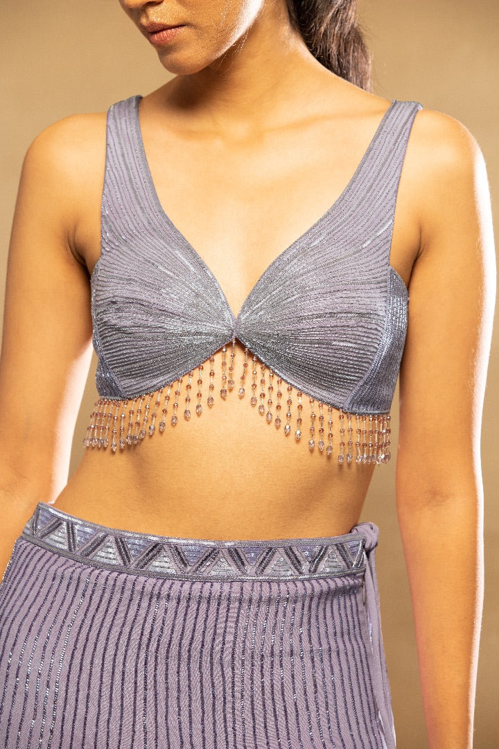HAND EMBROIDERED LEHENGA WITH TASSEL DETAILING IN THE SHADE OF LAVENDER AND AN EXQUISITE SEQUINNED BUSTIER WITH EMBROIDERED ORGANZA DUPATTA.