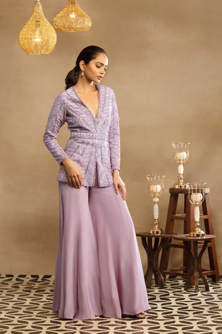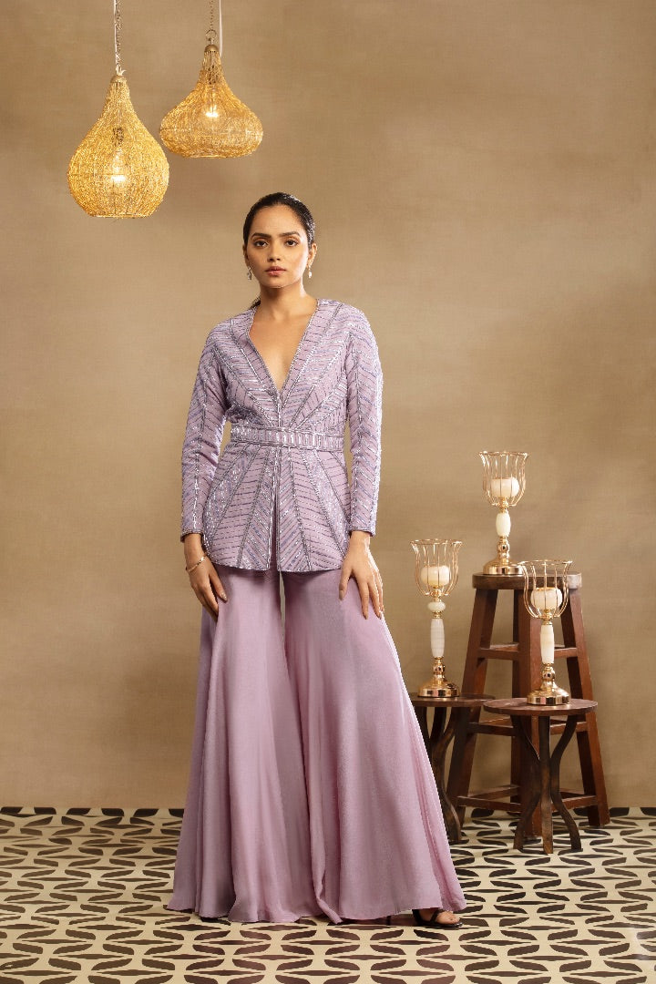 LAVENDER SATIN ORGANZA HAND EMBROIDERED SAREE WITH SCALLOP DETAILING PAIRED WITH AN EXQUISITE SEQUINNED BLOUSE