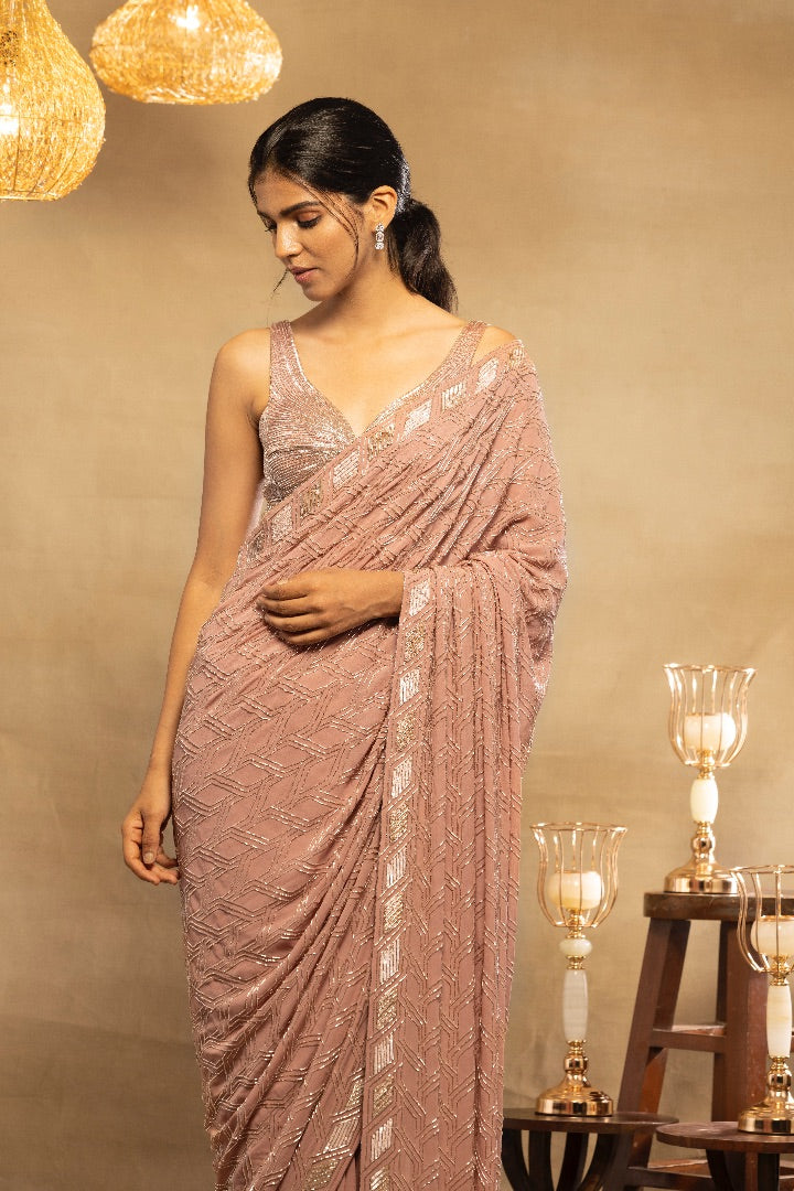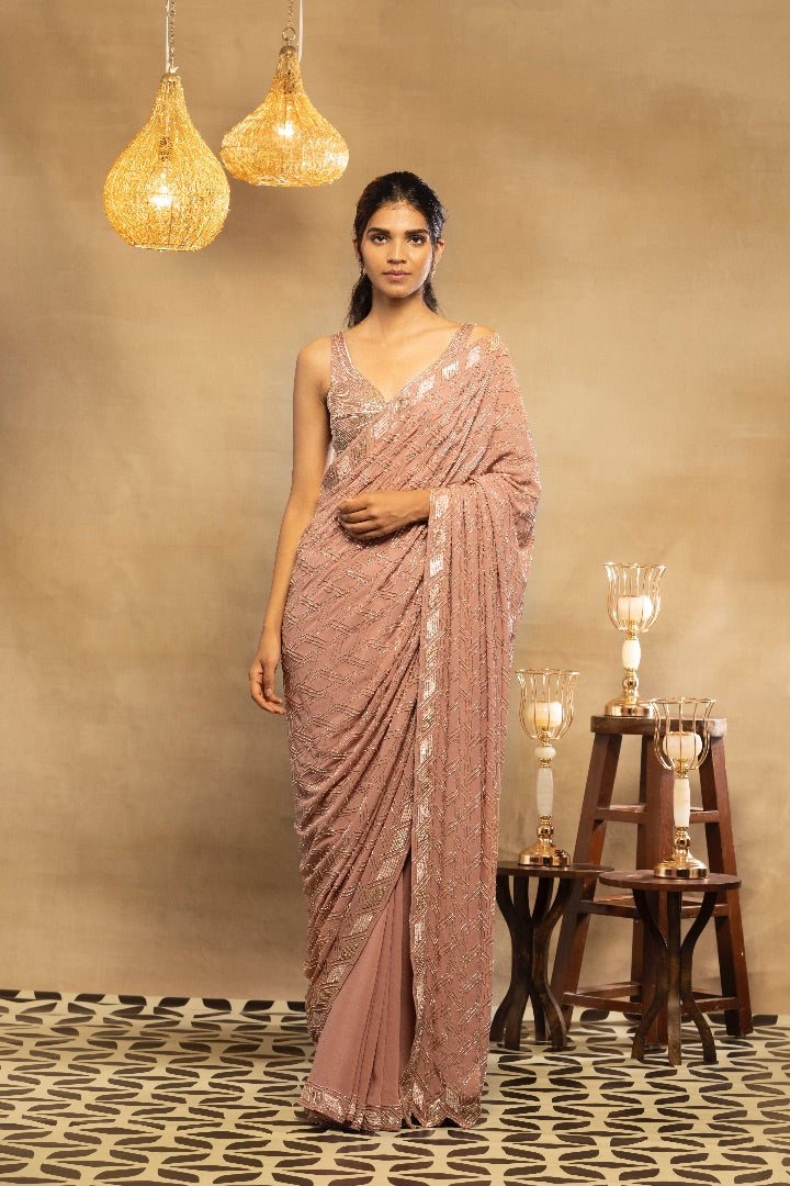 ROSE PINK HAND EMBROIDERED SAREE WITH INTRICATE JAAL EMBROIDERED PALLA AND AN ELEGANT SEQUINNED BLOUSE.