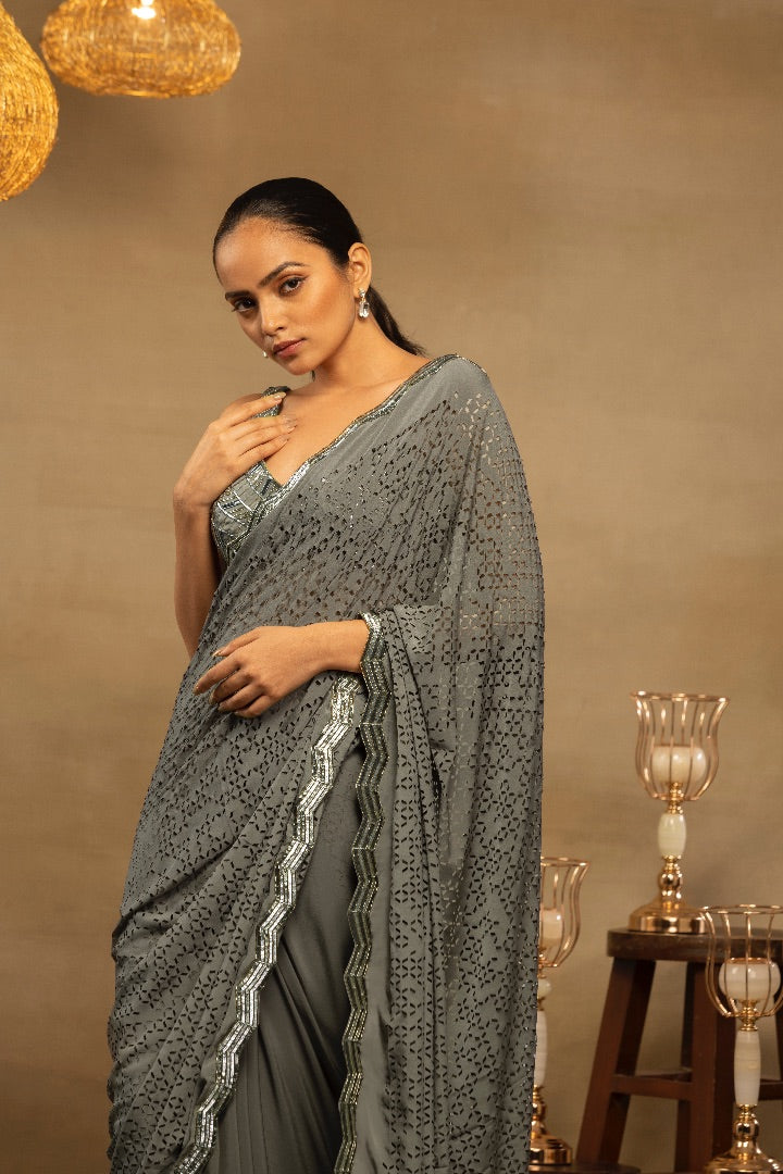 SAGE GREEN HAND EMBROIDERED SAREE WITH SCALLOP DETAILING AND AN INTRICATE LASER CUT PALLA PAIRED WITH A BUSTIER BLOUSE IN OUR SIGNATURE SEQUIN WORK.