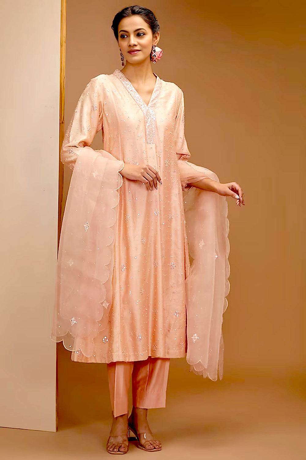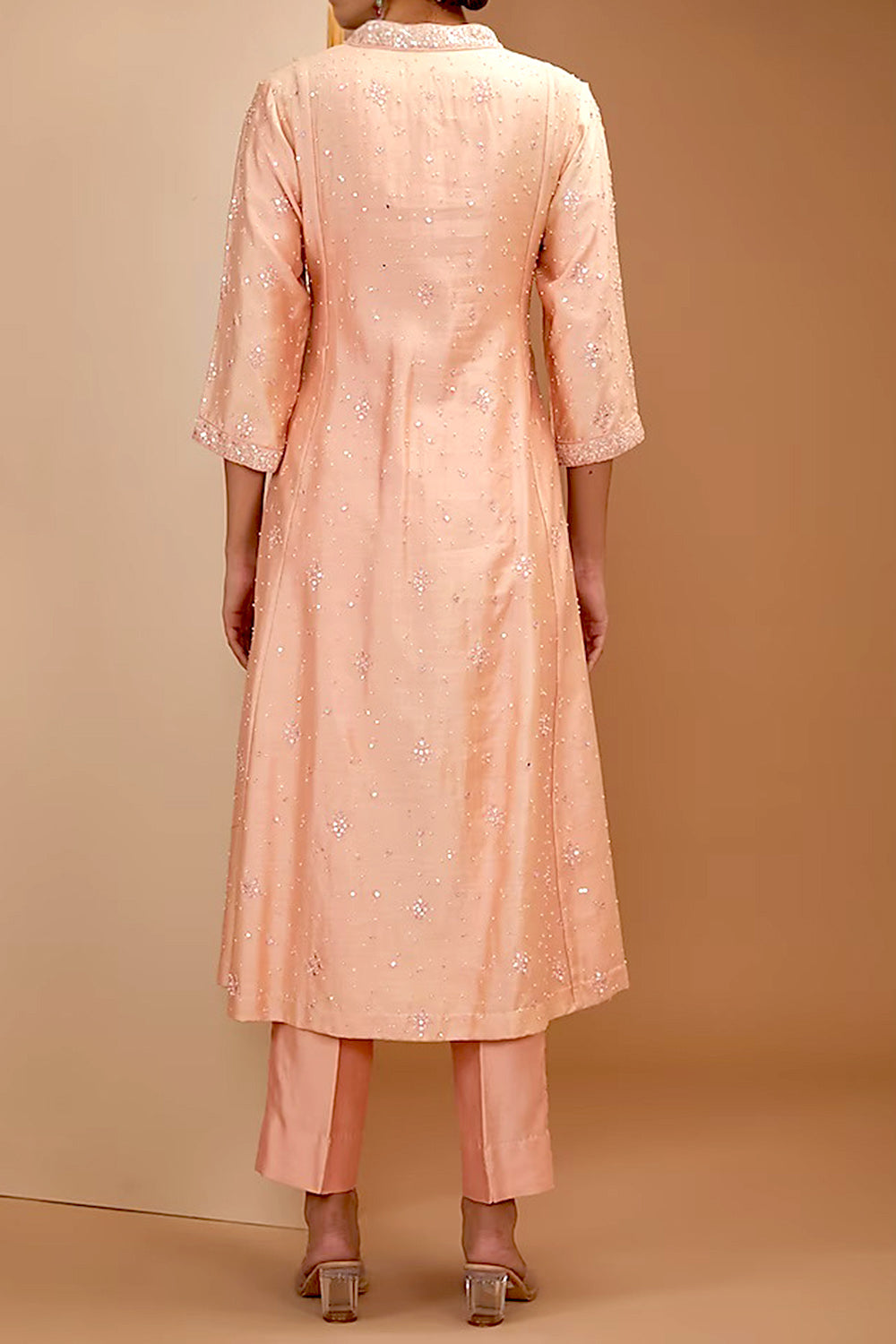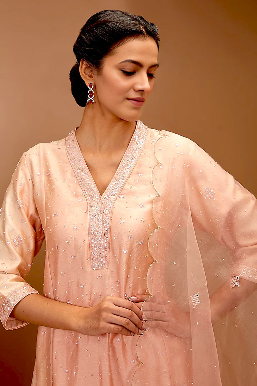 The peach kurta set features intricate floral thread, sequin, and bead embroidery on silk organza and pure chanderi silk. with a v-neckline and three-quarter sleeves, it includes three components: dupatta, kurta, and pant, offering a complete ensemble. this elegant set is perfect for special occasions, exuding charm and sophistication.
