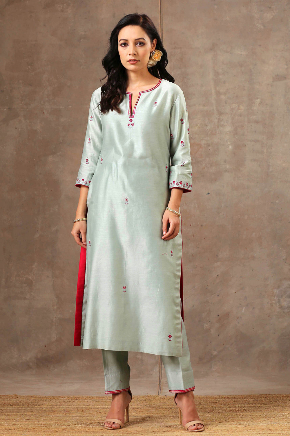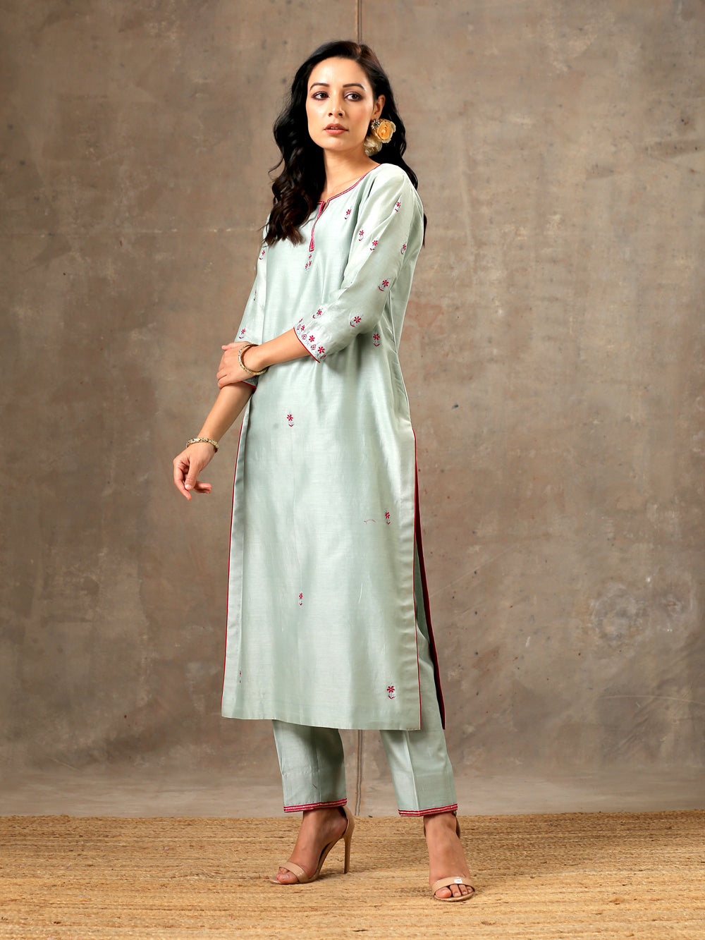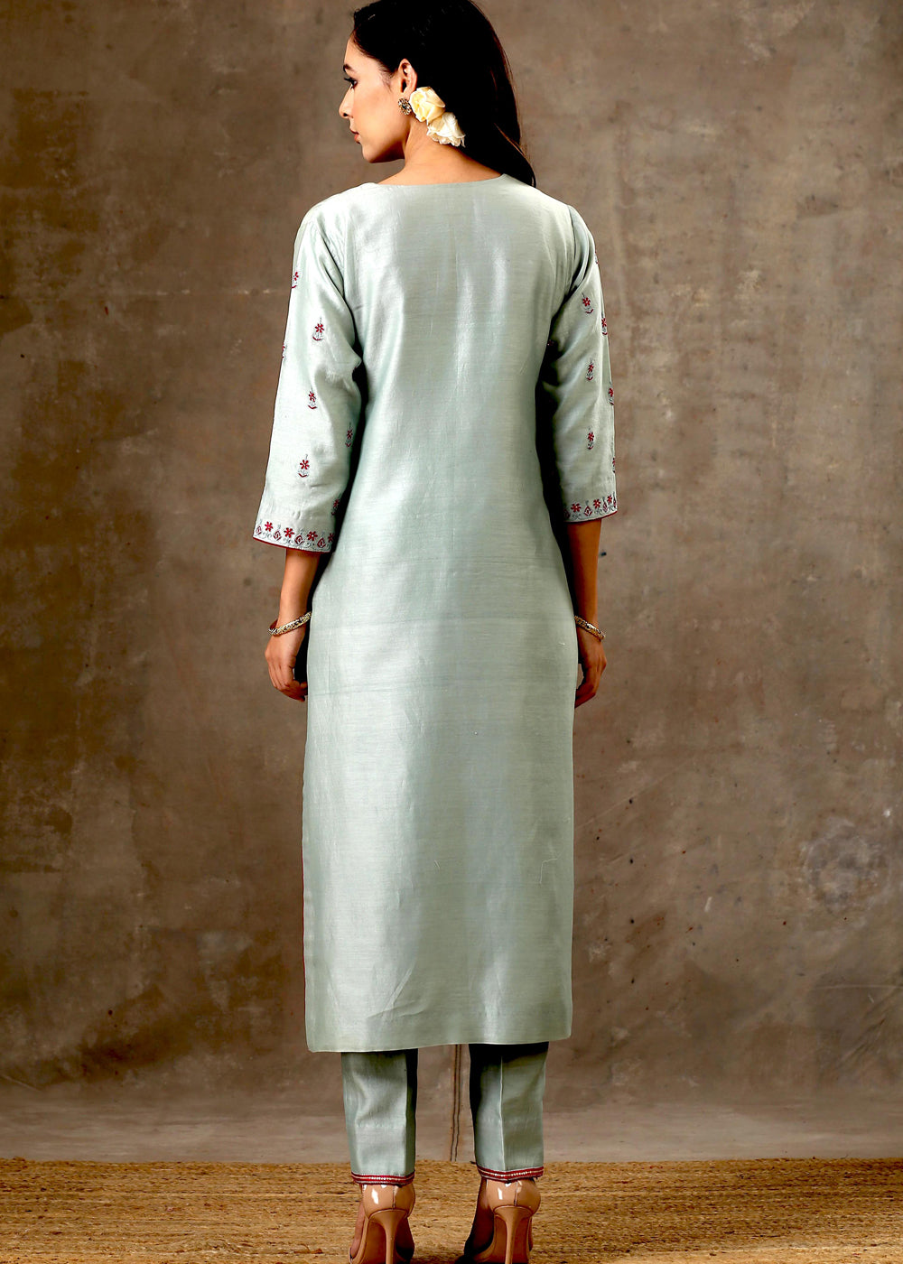Sage Green Pink Hand Embroidered Chanderi Silk Kurta Set