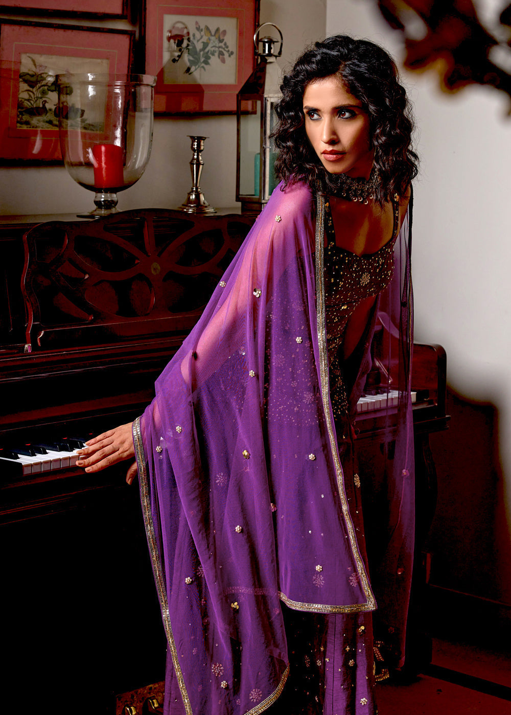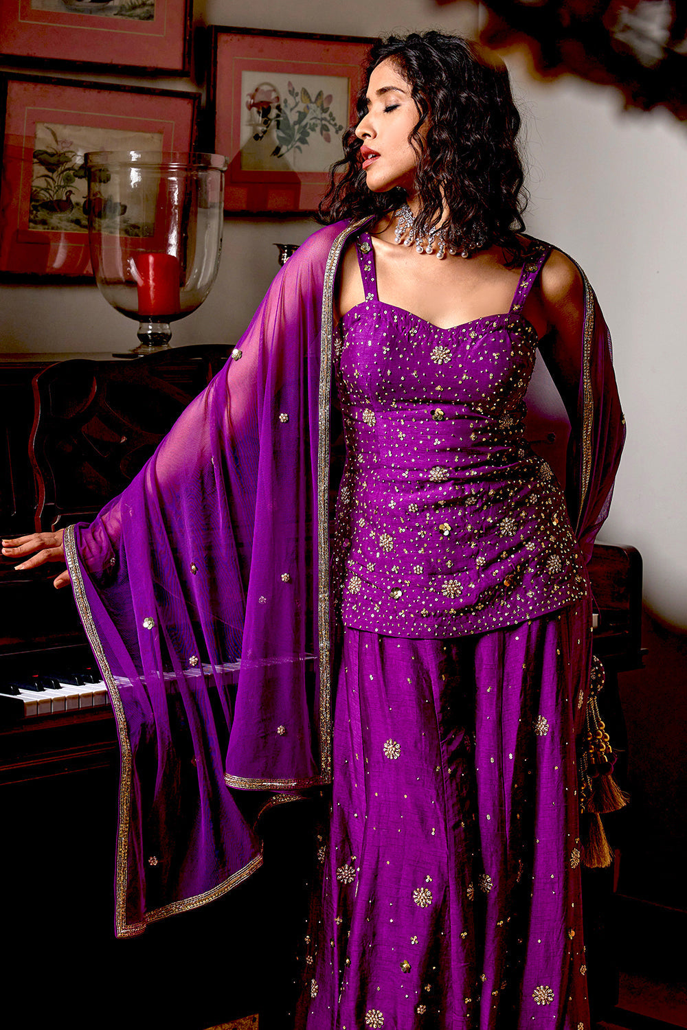 Elevate your style with our 'sassy sharara set in an alluring shade of purple. this set features a stylish strap top adorned with intricate hand embroidery, paired with kali palazzo sharara bottoms. to complete the look, we've included a pure tulle dupatta, making it the perfect choice for your cocktail and wedding events. with its contemporary design and attention to detail, this ensemble is your ticket to turning heads and making a bold fashion statement.