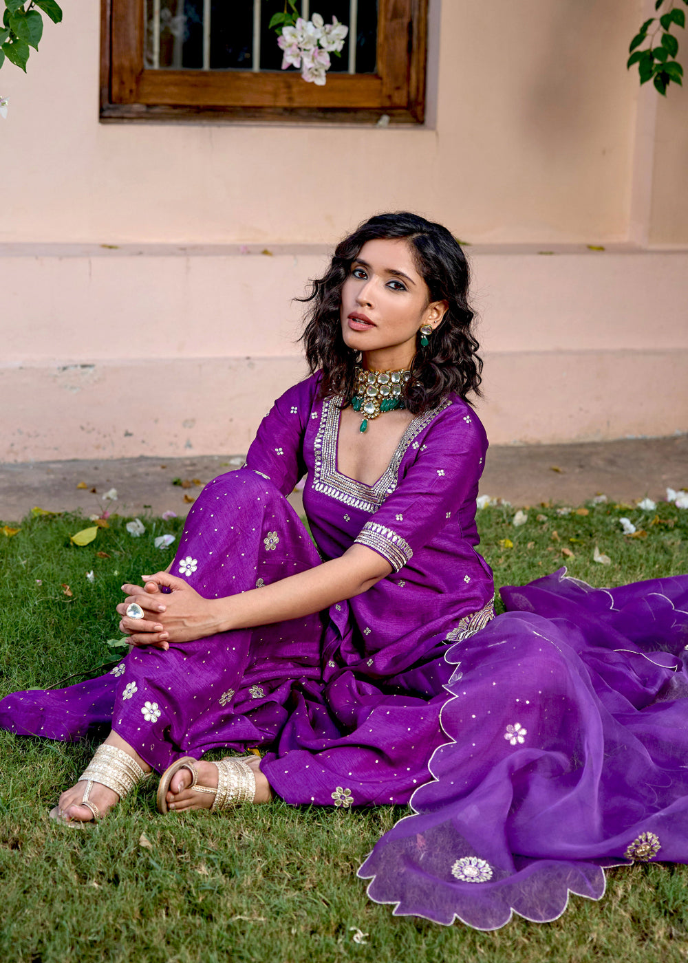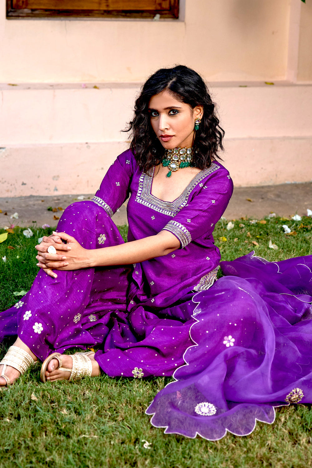 The "mastaani sharara set" in purple is crafted from dupion silk and pure silk organza fabrics. it features hand embroidery, adding a touch of intricate detail to the ensemble. this set includes a kurta, sharara, and dupatta.