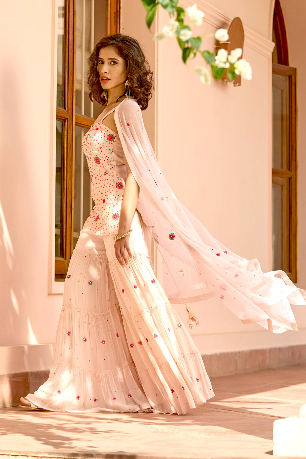 The light peach color sharara set features a delicate and elegant design perfect for special occasions. crafted from georgette and tulle fabrics, this set includes a kurta, sharara, and dupatta, providing a complete ensemble. the sharara is designed with a side zipper for ease of wear and is padded for added comfort. additionally, the set is embellished with hand embroidery, adding intricate detailing to enhance its overall appeal.