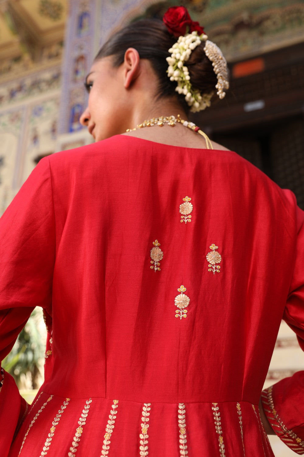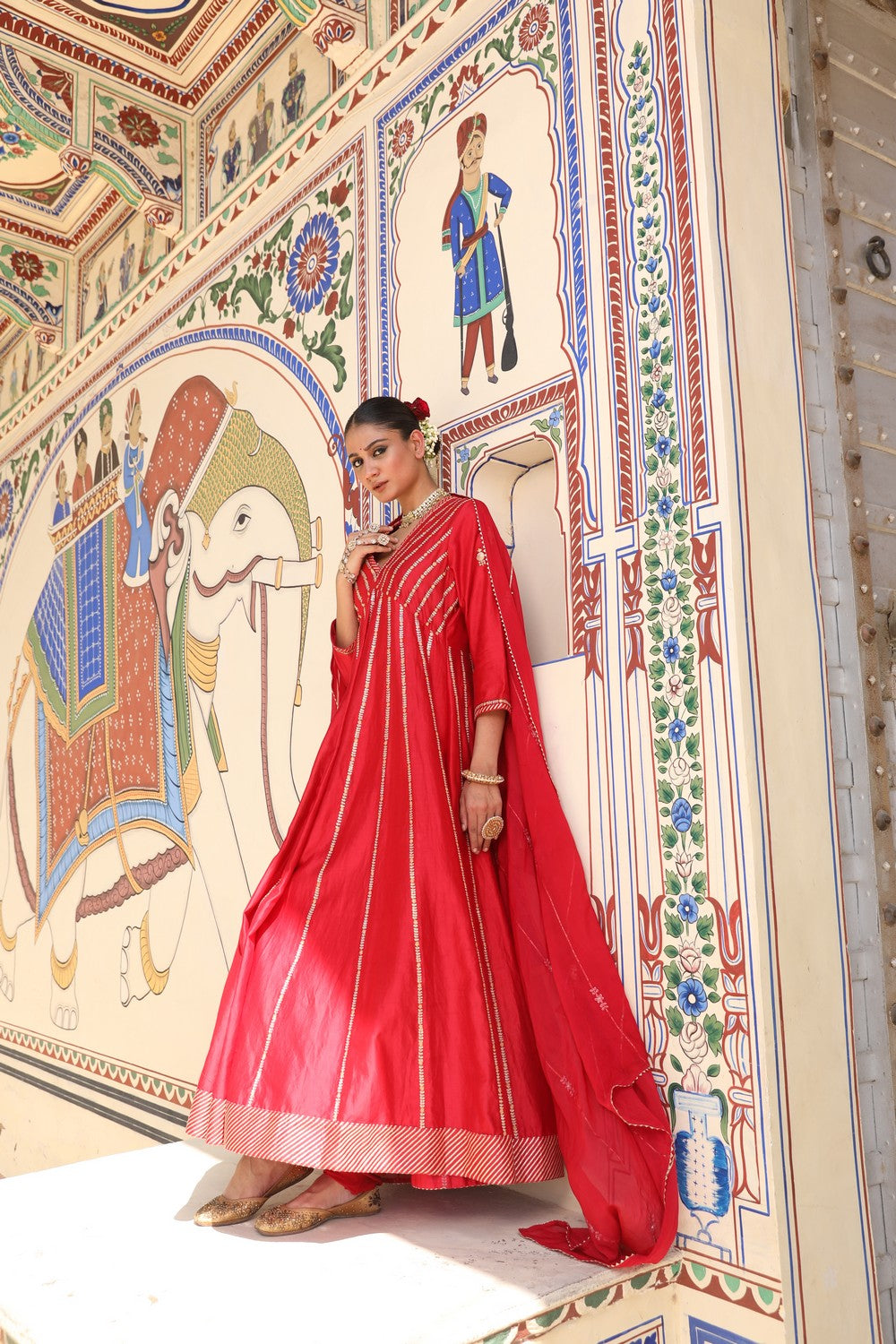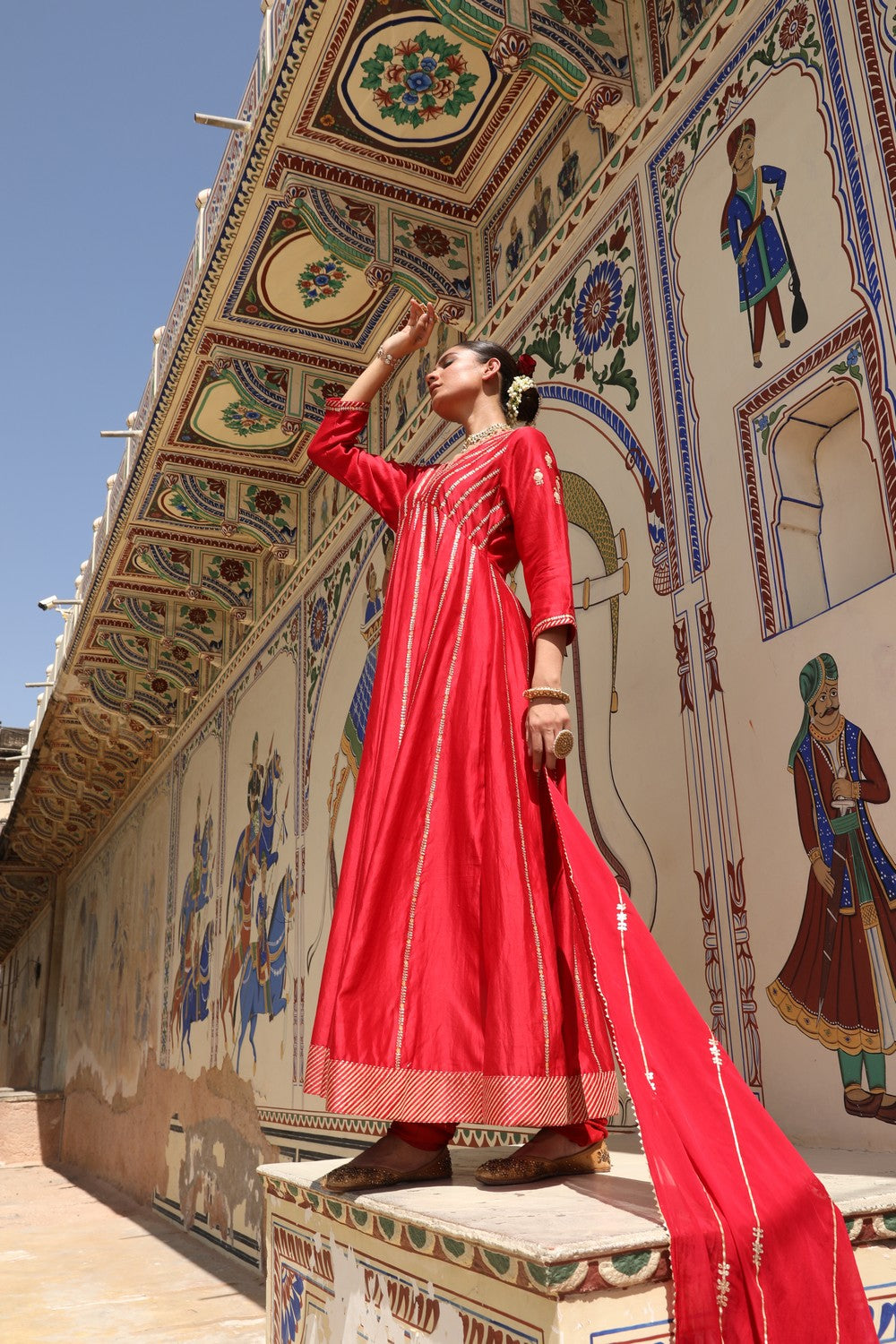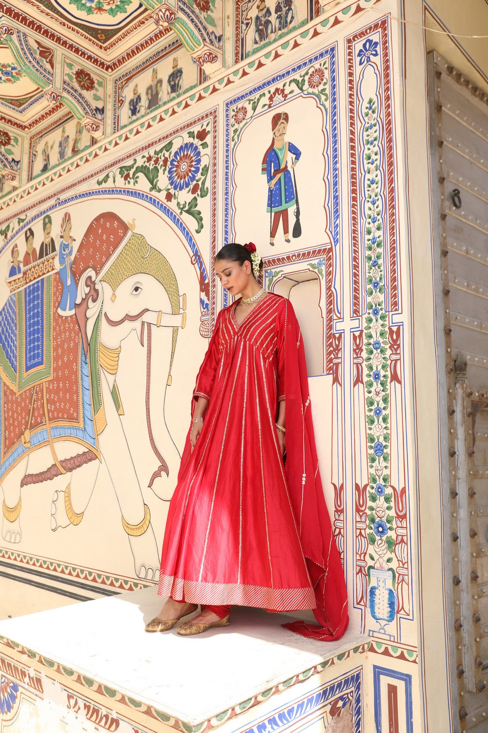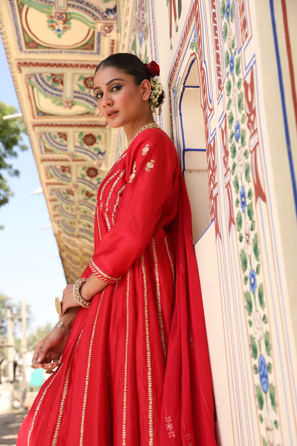 Exude timeless elegance with our Begam Anarkali Set, crafted in luxurious silk and lined with soft 100% cotton for a comfortable fit. The striking red Anarkali is adorned with delicate hand pitta embroidery, showcasing fine craftsmanship. This 2-piece stitched ensemble includes a 52-inch flowing Anarkali and a 2.5-meter dupatta, perfect for weddings and festive celebrations.