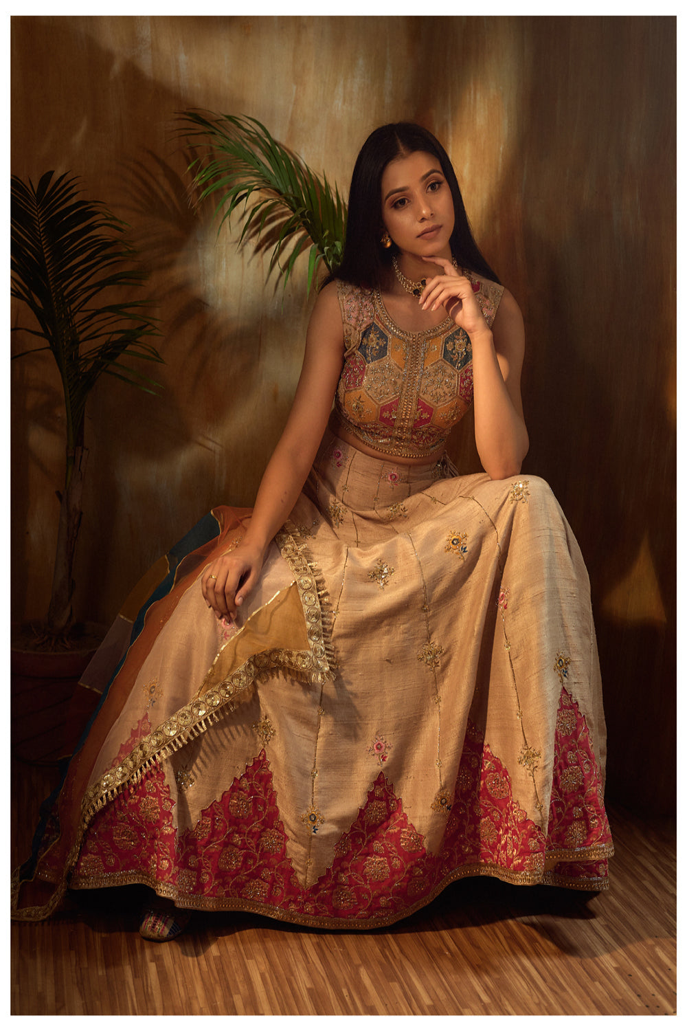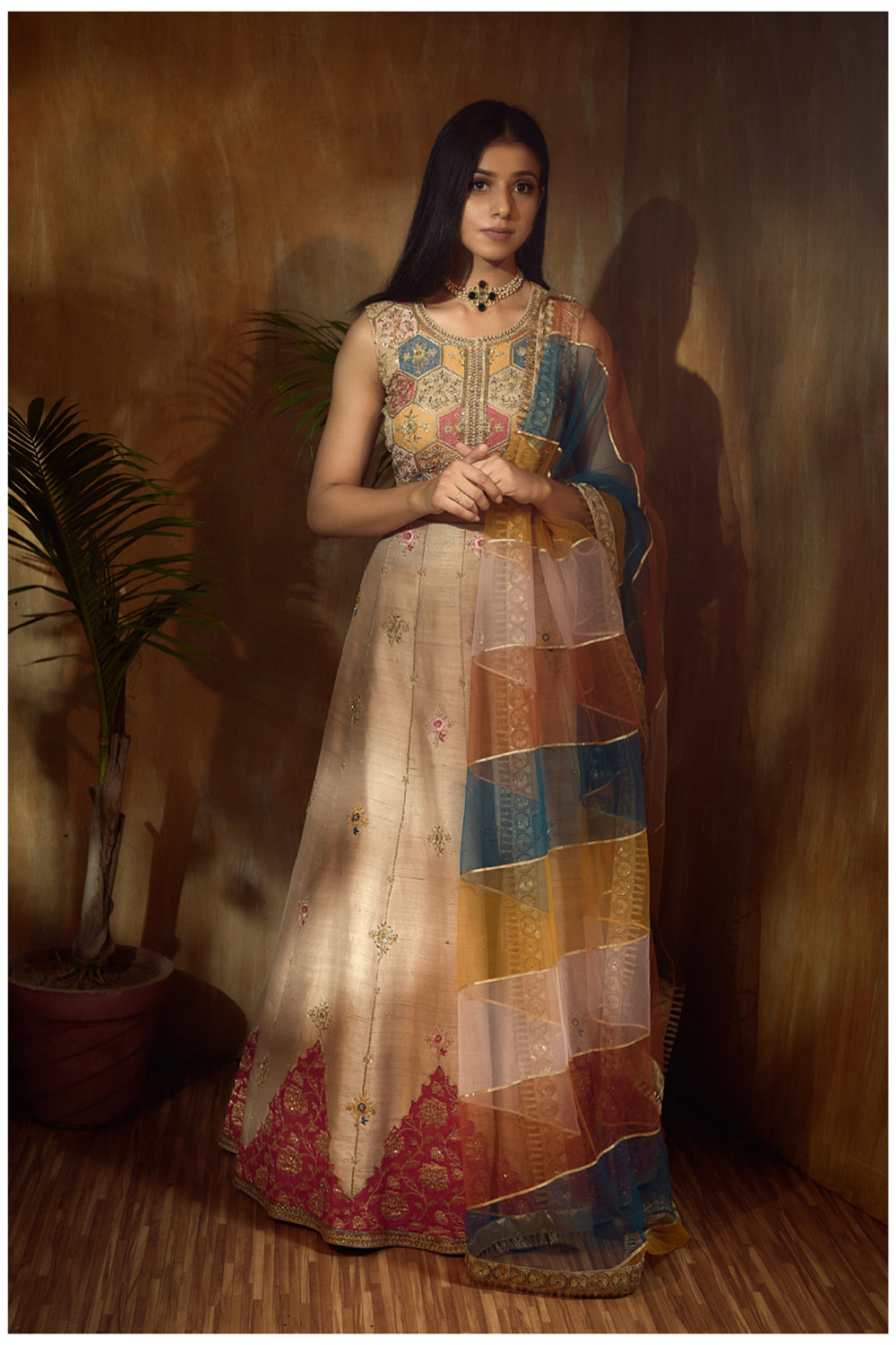 Beige Lehanga with Magenta Patch and Multi Color thread work top and multi shaded duppata