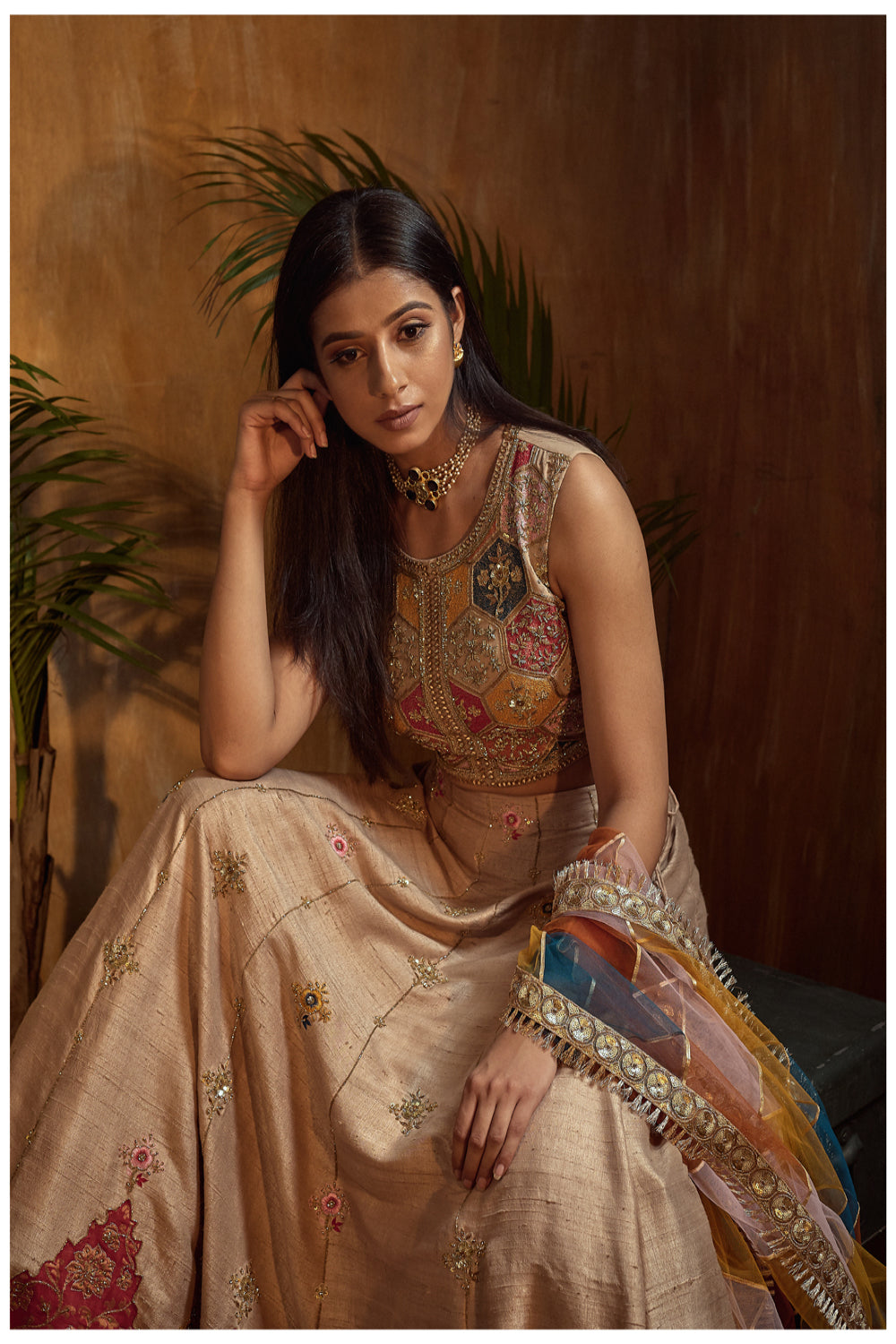 Beige Lehanga with Benarsi Patch and Multi Color thread work top