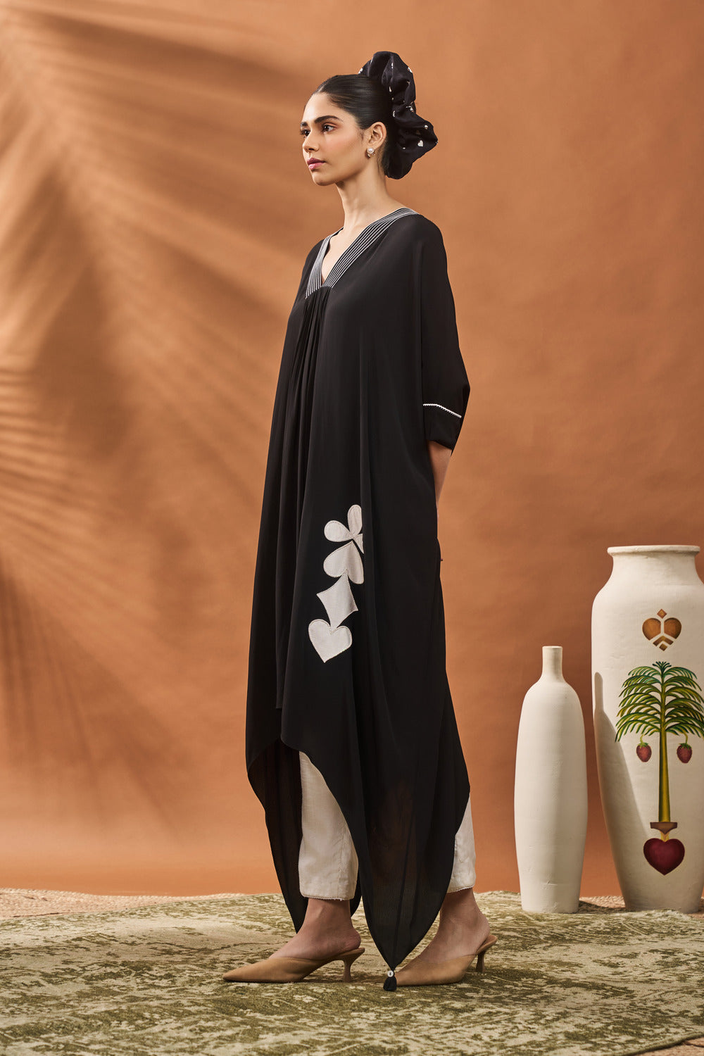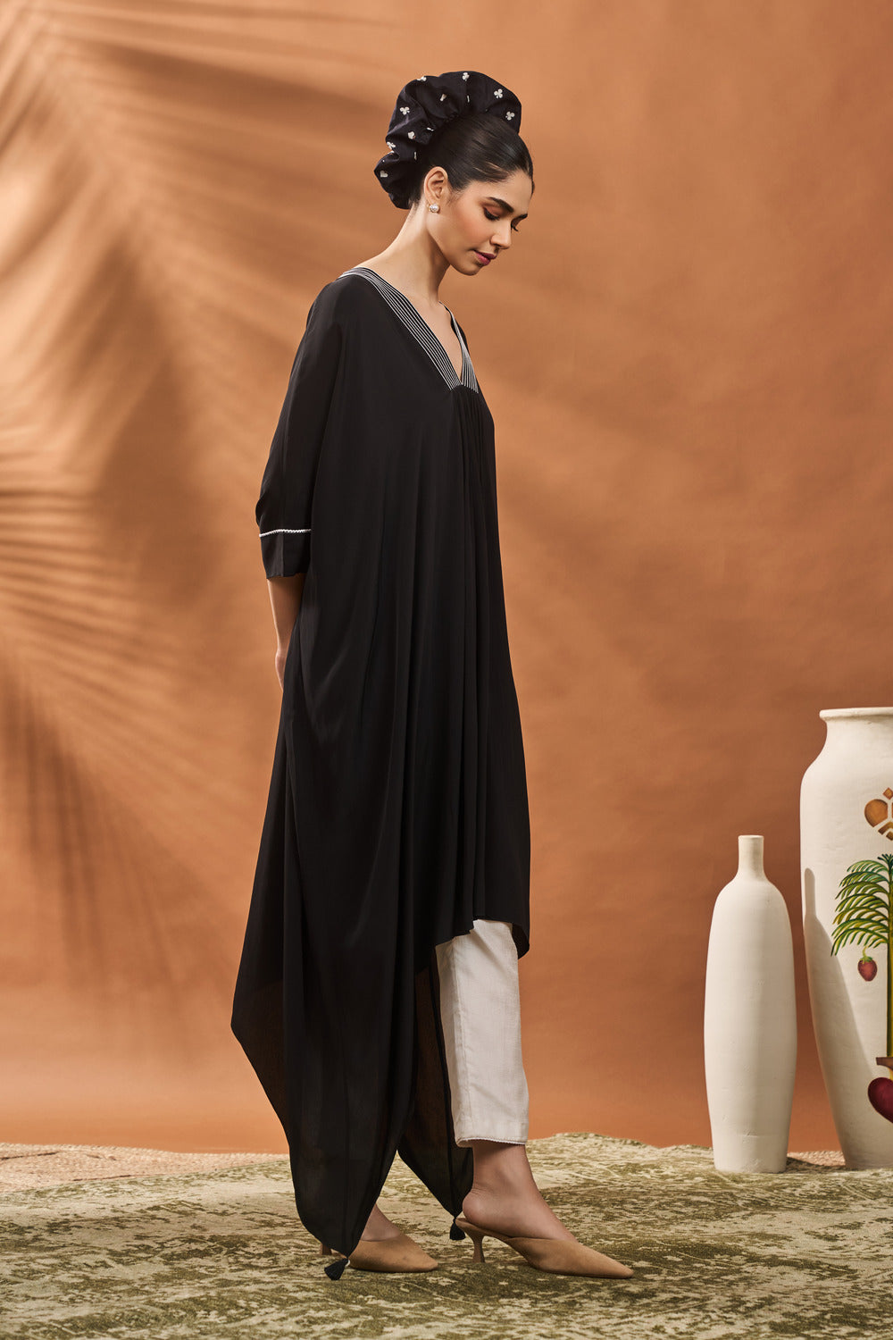TUNIC - A- line tunic is embellished with applique embroidery | 'V' neckline adorned with dhagai embroidery | Full sleeves with crochet lace border