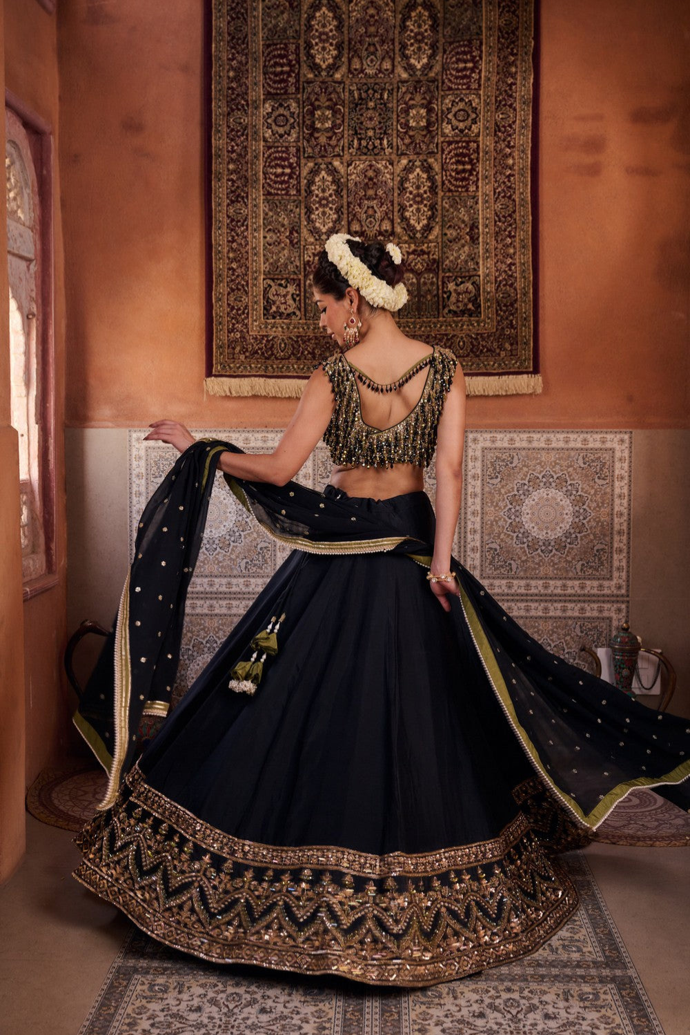 Black and mehendi green embellished blouse, lehenga and dupatta