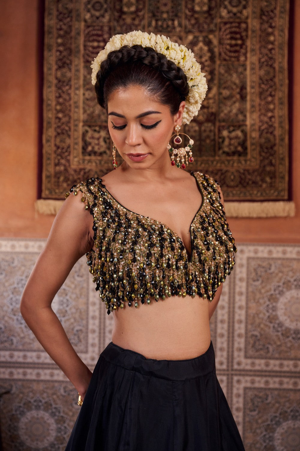 Kapda Dori's stunning black premium upada silk lehenga, beautifully adorned with intricate cutdana, sequins, crystals and pearls work. The black color adds a touch of glamour and sophistication to your look, while the soft fabric ensures you feel comfortable all day or night long. It is styled with a mehendi green premium upada silk blouse embroidered with crystals, drops and sequins . Pair it with complimenting black geogratte embroidered dupatta.