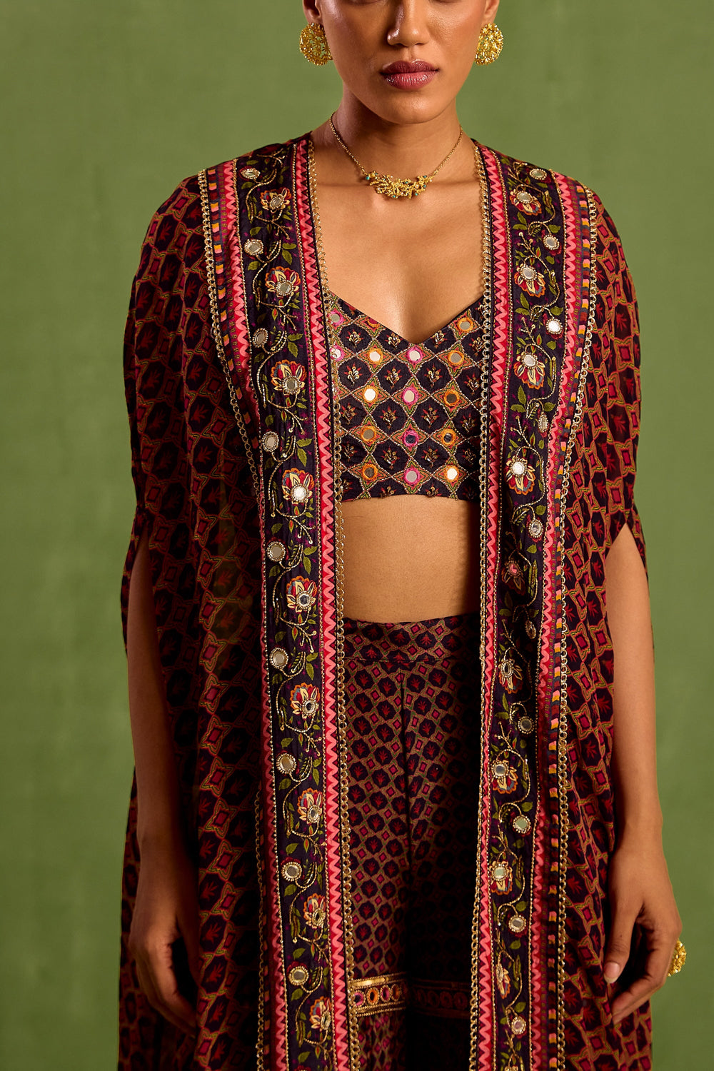 Black zari embroidered border, asymmetric geometric print cape, embellished by beads and mirrorwork. Paired with bead and mirrorwork embellished padded blouse. Comes with matching gharara.
