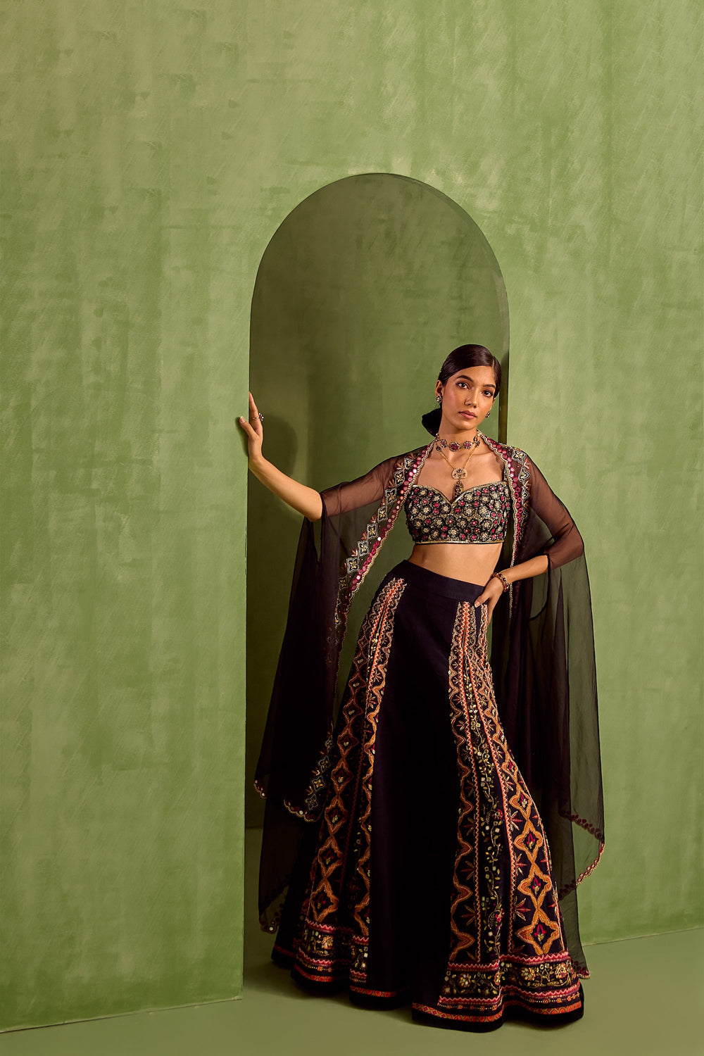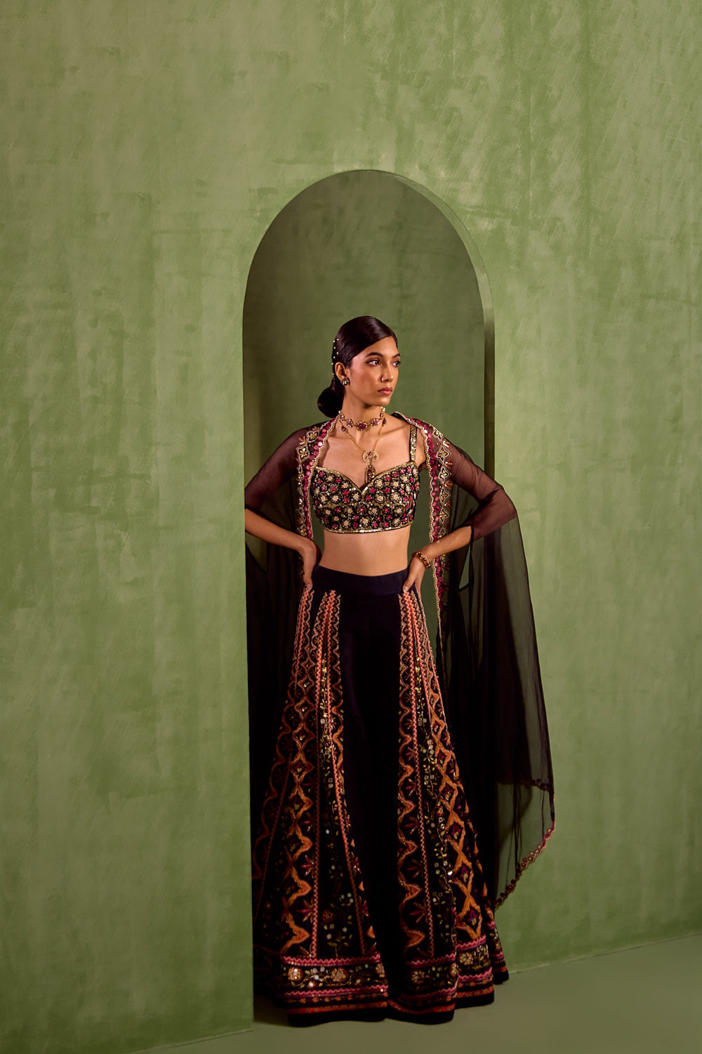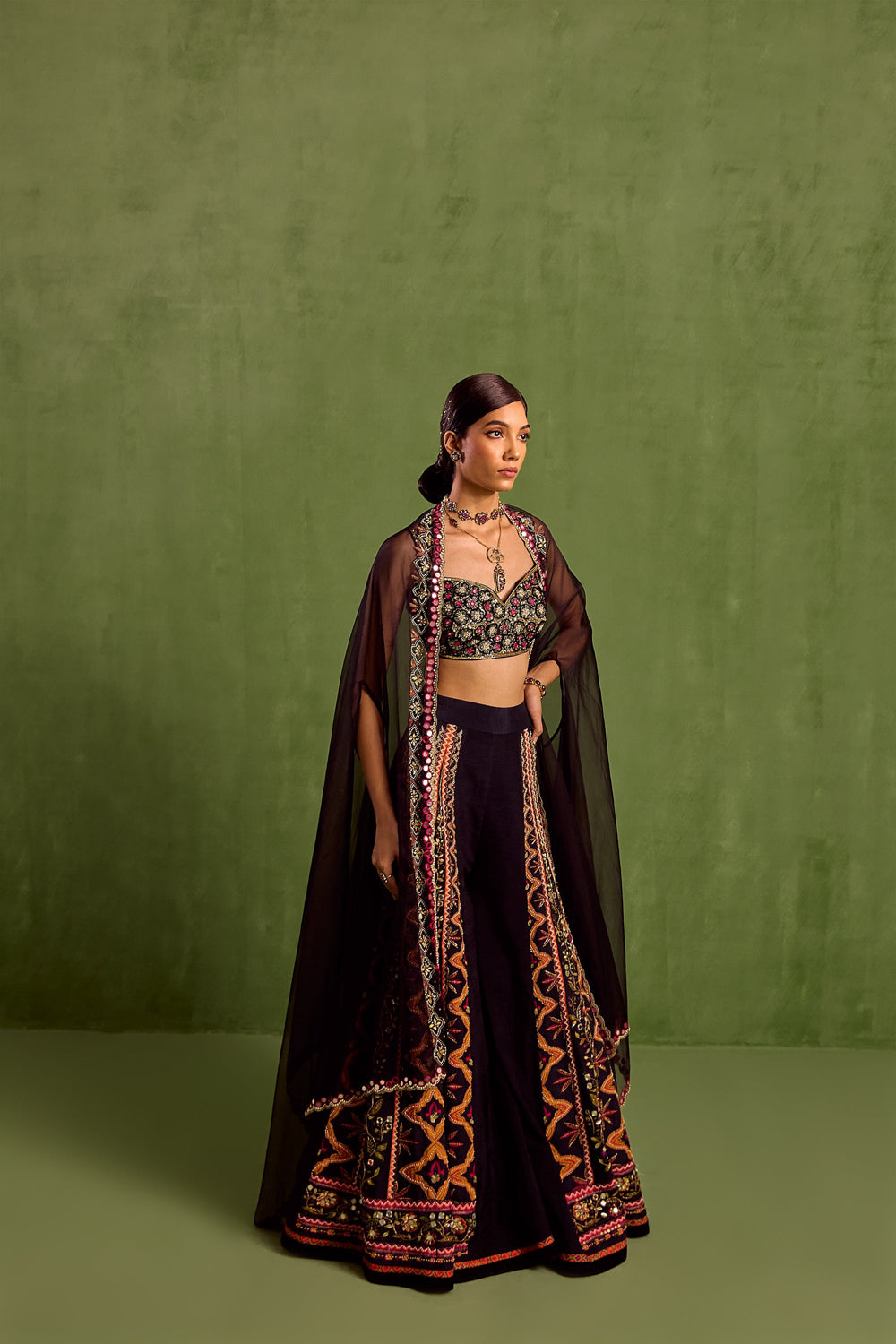 Black zari embroidered border, asymmetric and mirrorwork cape. Paired with bead and mirrorwork embellished padded blouse. Comes with can can attached, geometric print bead embellished sharara.