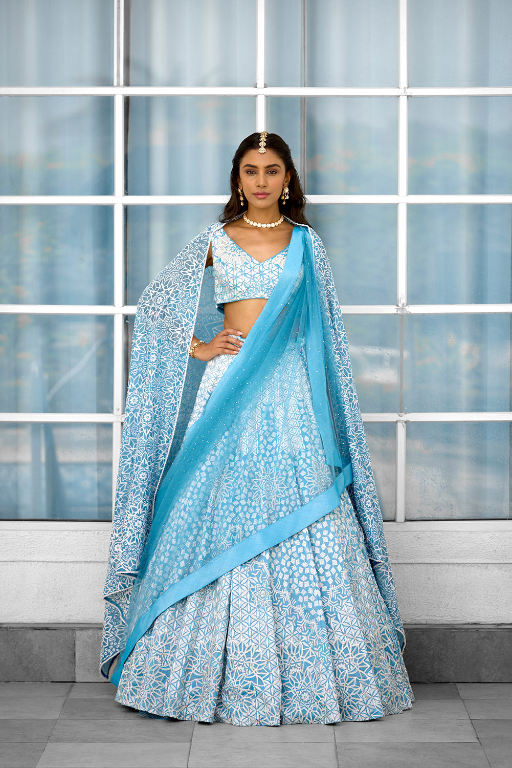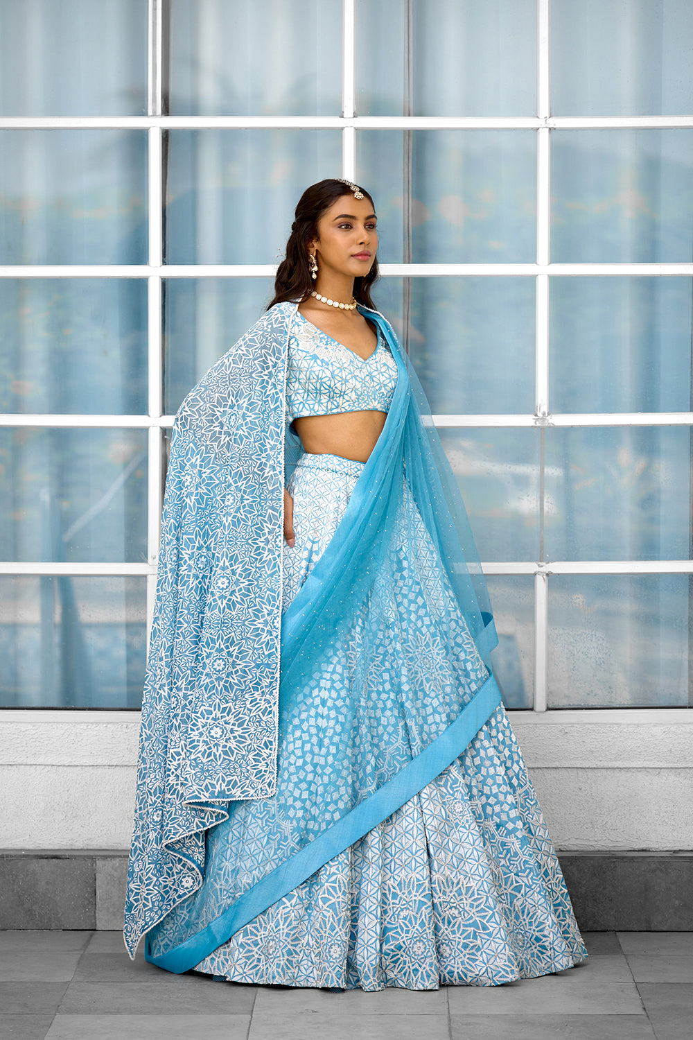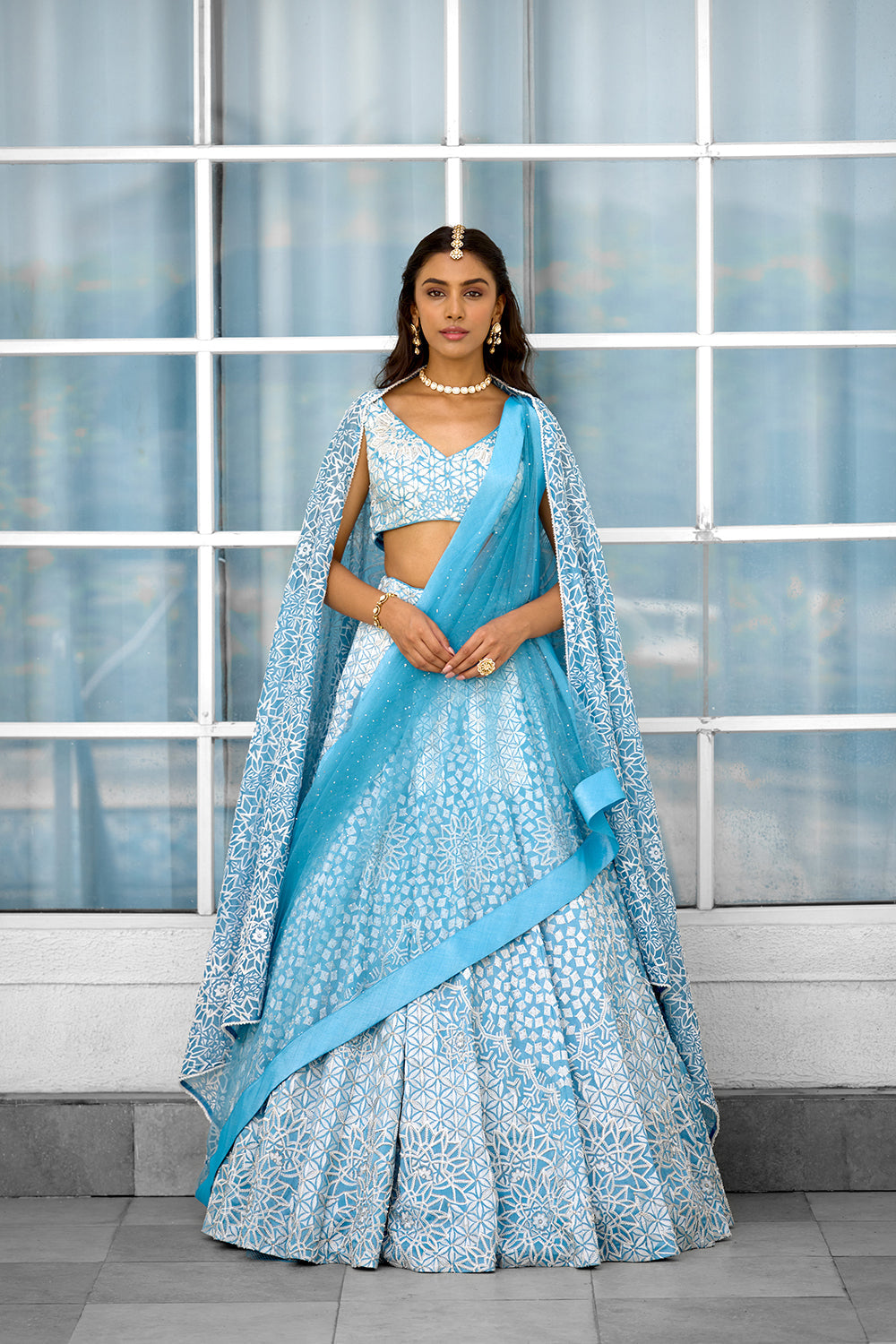 Lehenga Set with embellished blouse and heavy dupatta with another light dupatta.