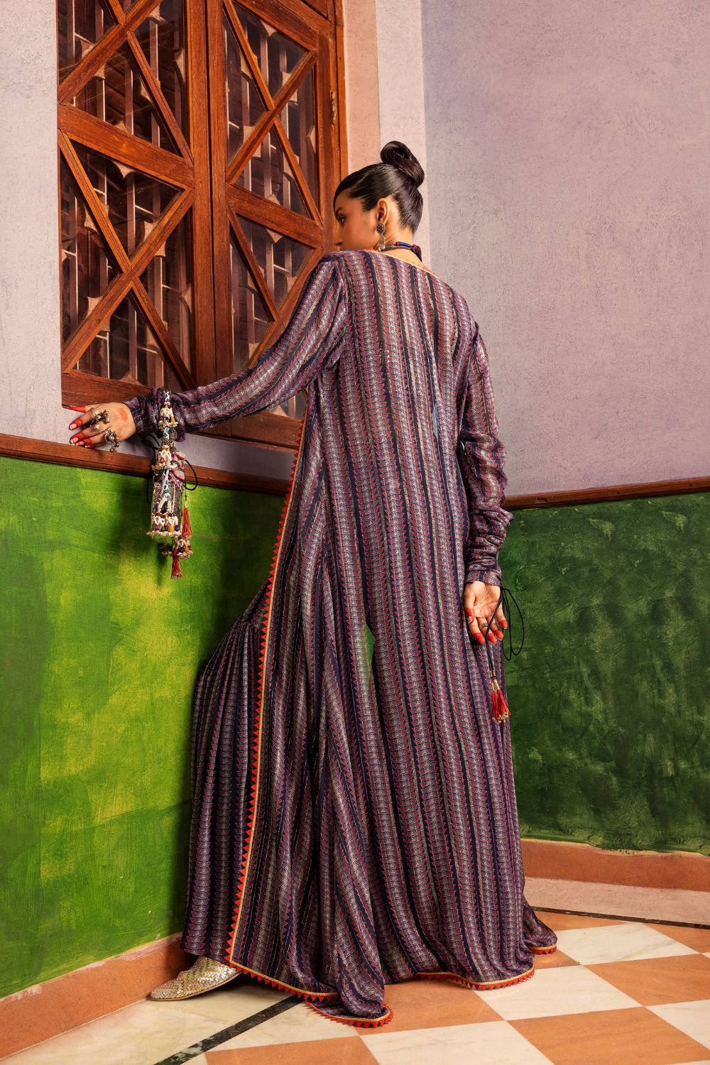 Featuring a multi-color embroidered bustier in silk base. It is paired with printed gharara pants in georgette and matching jacket , with churidaar sleeves & tassel details.