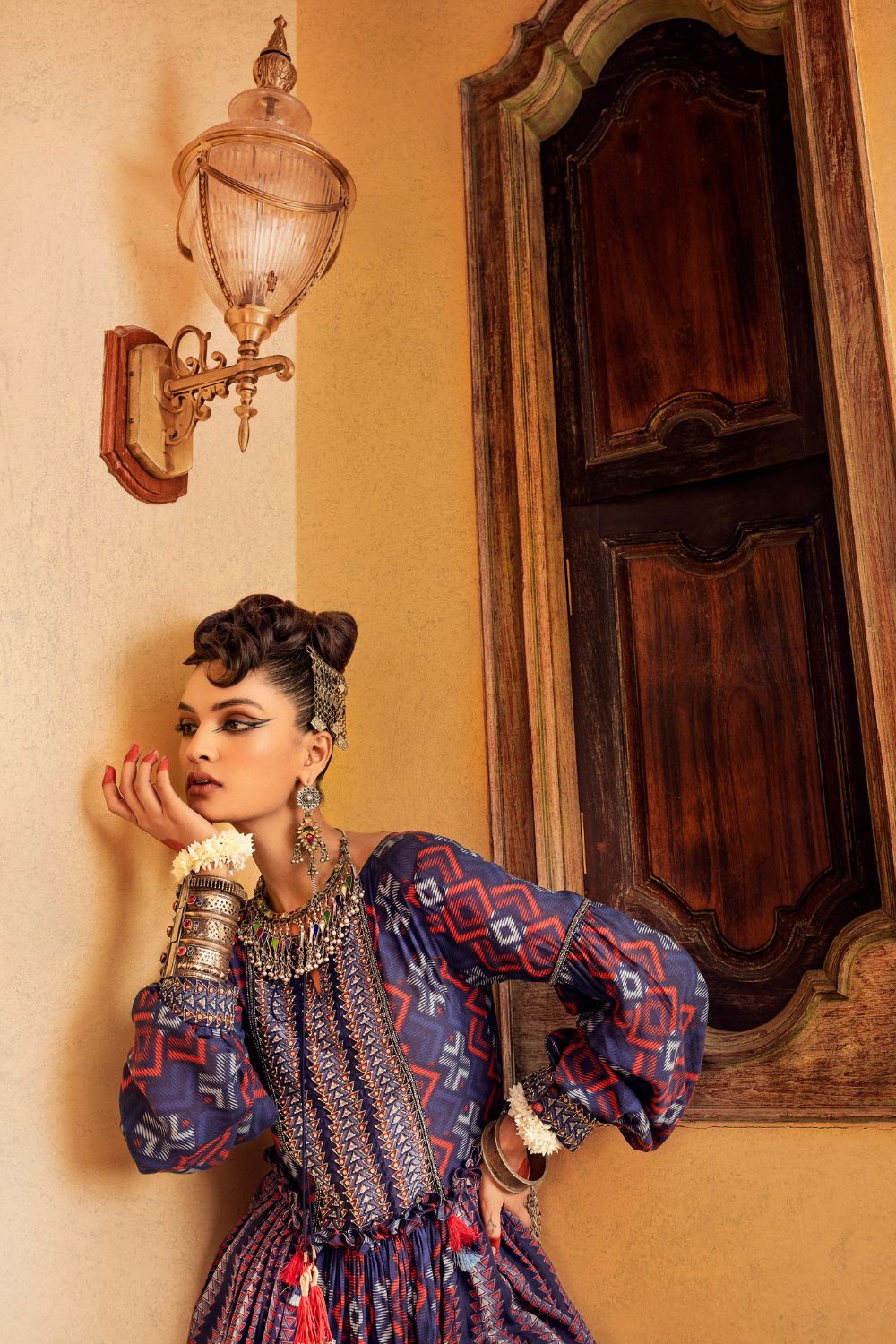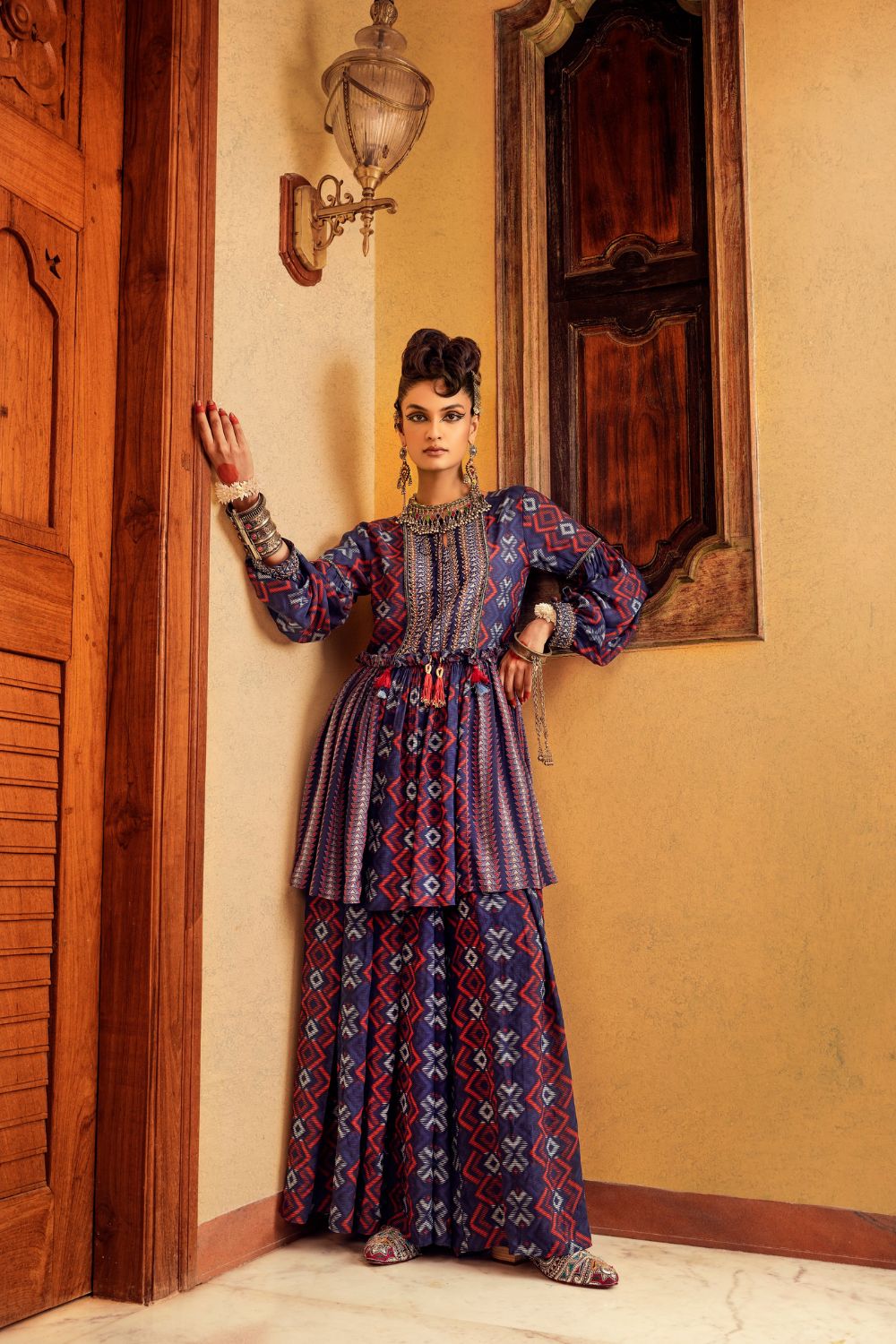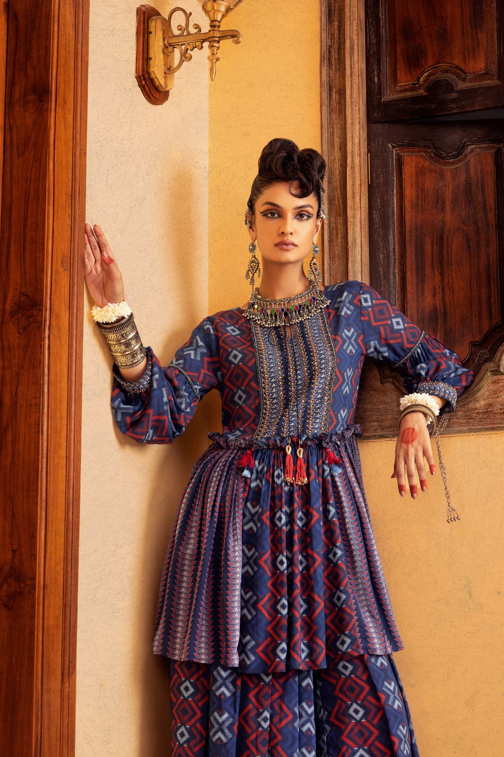 Featuring a blue printed peplum top in mal base with embroidery and tassel details. It is paired with matching printed pallazzos.