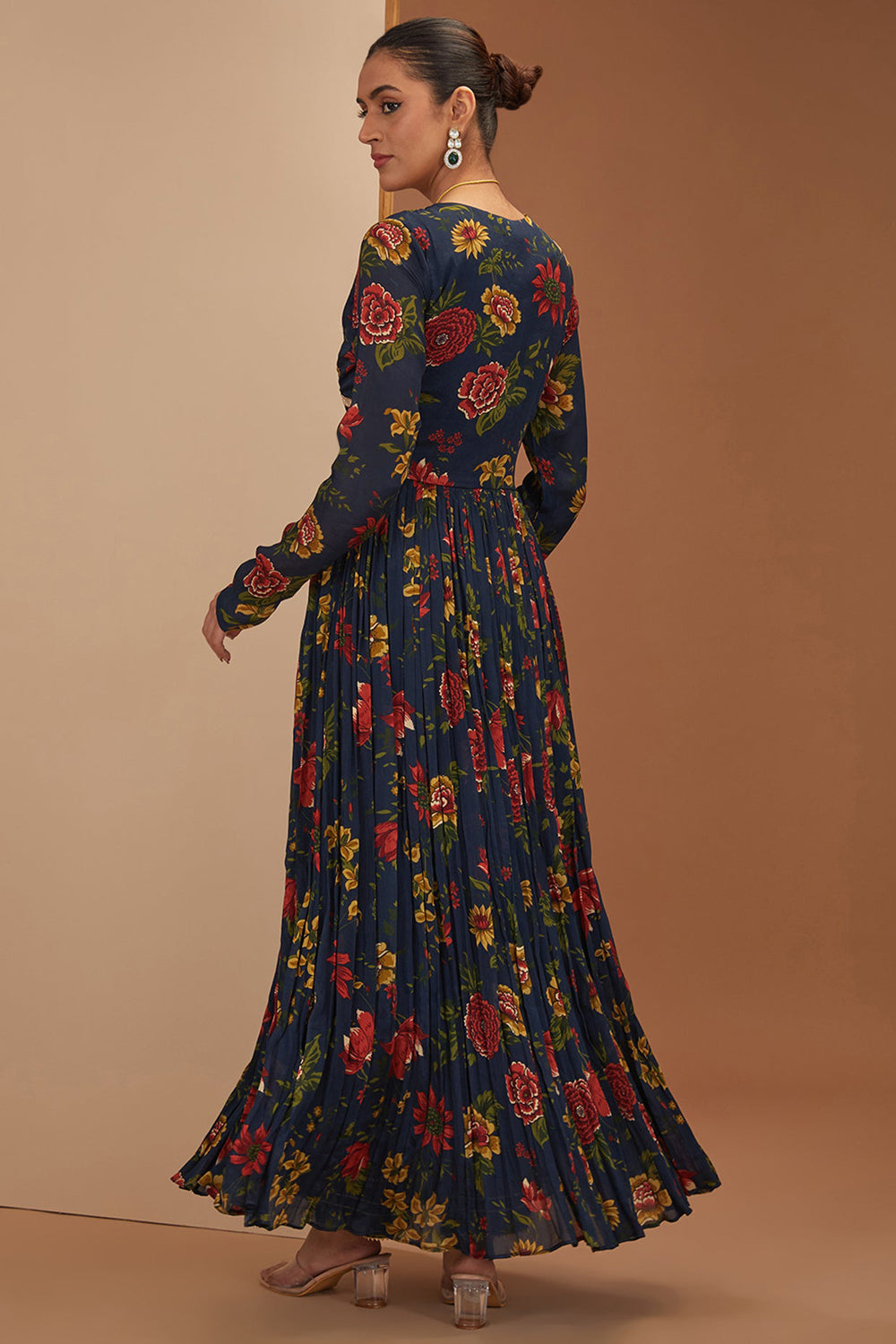 Blue Viscose Chinon Printed And Embroidered Floral Angarkha Anarkali Set For Women