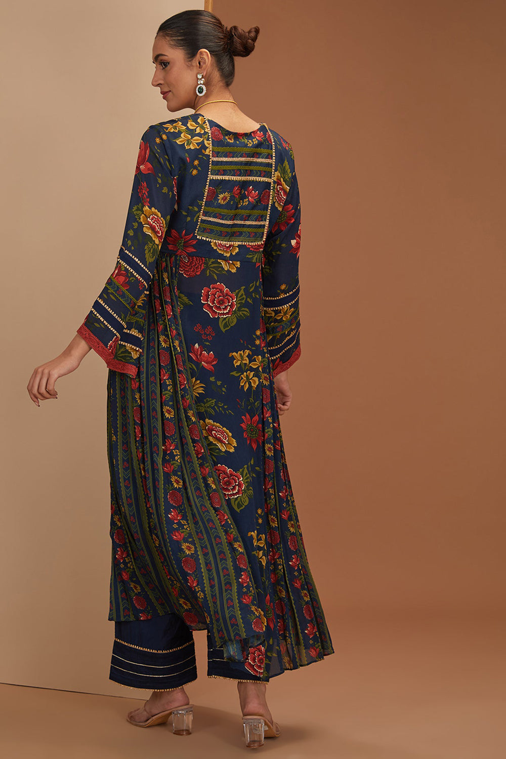 Blue anarkali with side intricate pleated panels, all over multi color floral, stripe print & placement metallic gota patti embroidery. Paired with straight pant & printed bordered dupatta.