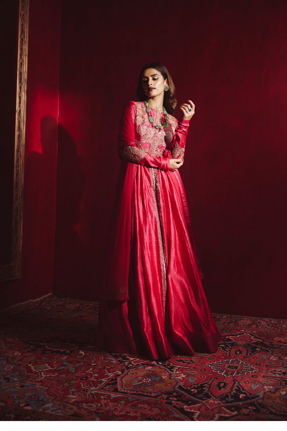 Cherry red raw silk full length embroidered anarkali with net embroidered dupatta