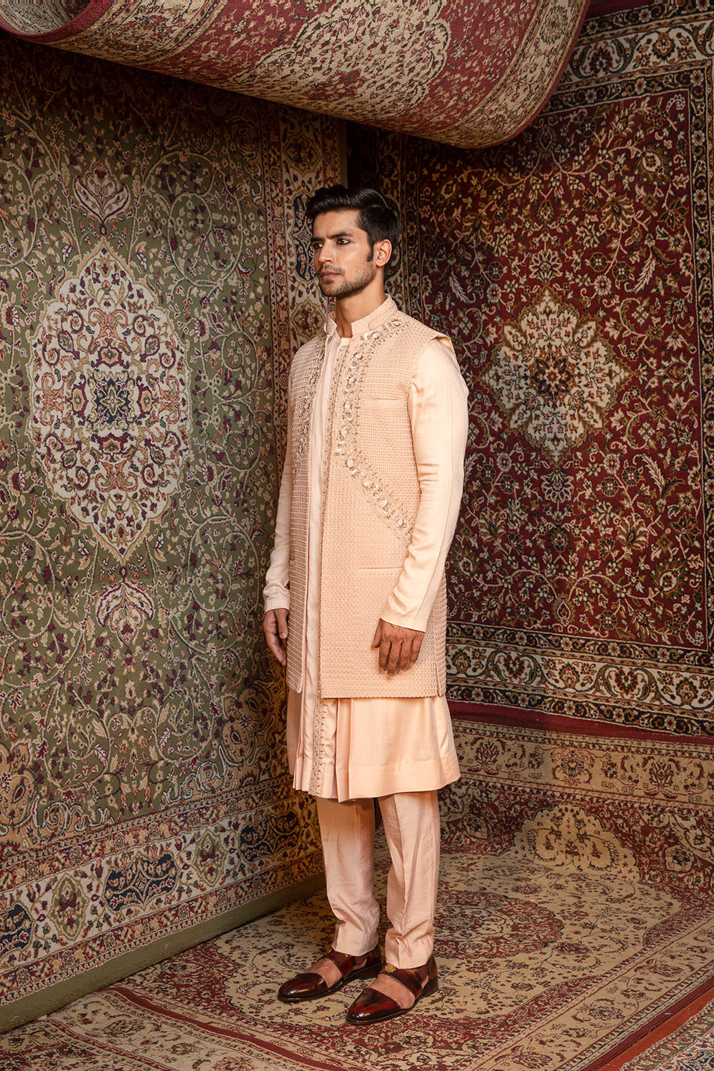 Front Open Waistcoat With Resham, Dabka And Metal Work With Ghera Kurta.