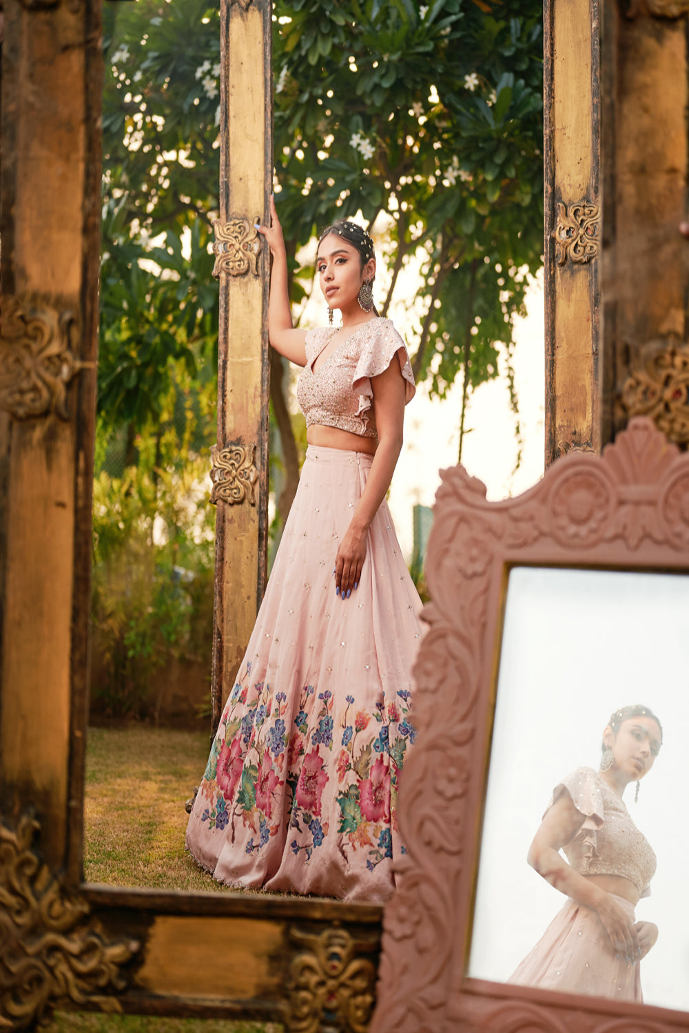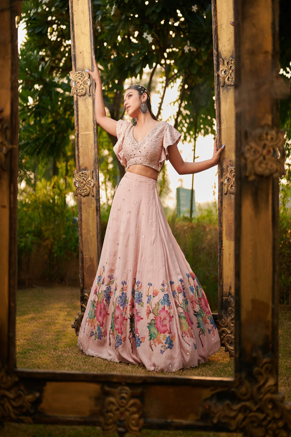 Baby Pink Lehnaga with Handpainted flowers and sequence embellishments
