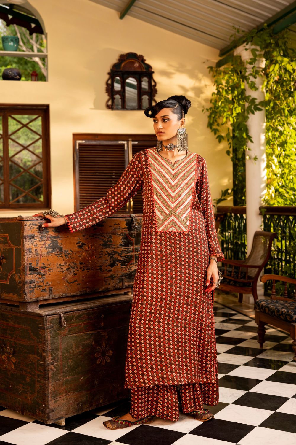 Featuring a brown printed kurta in satin base with embroidery yoke. It is paired with matching pallazzo pants