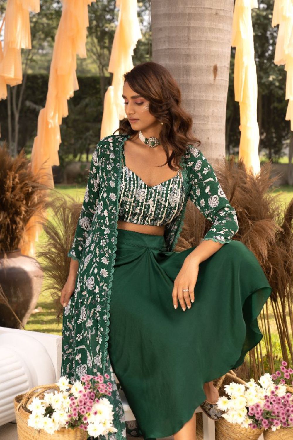 Featuring here a bootle green printed cape set. This set has an embroidered inner and a skirt