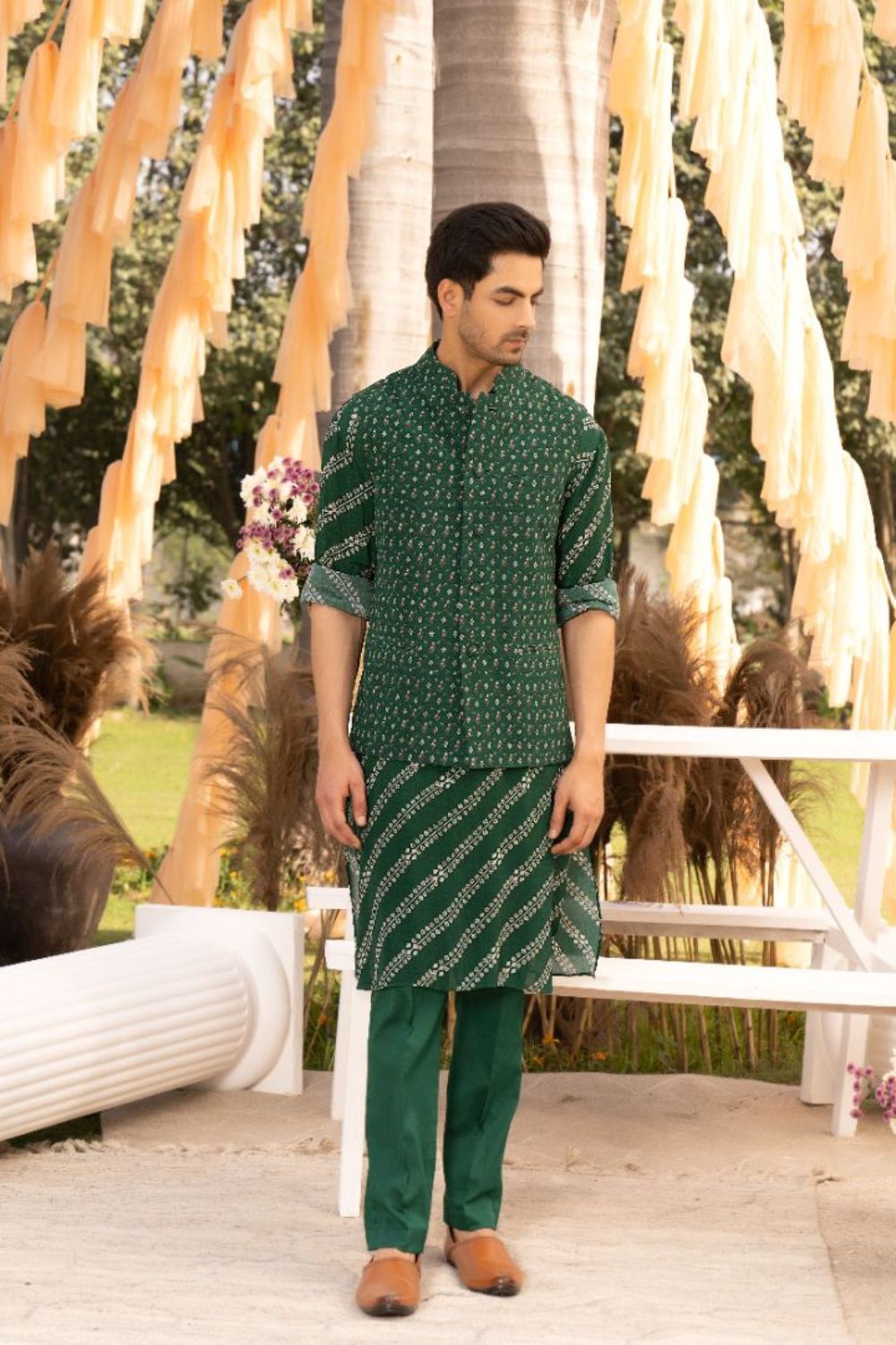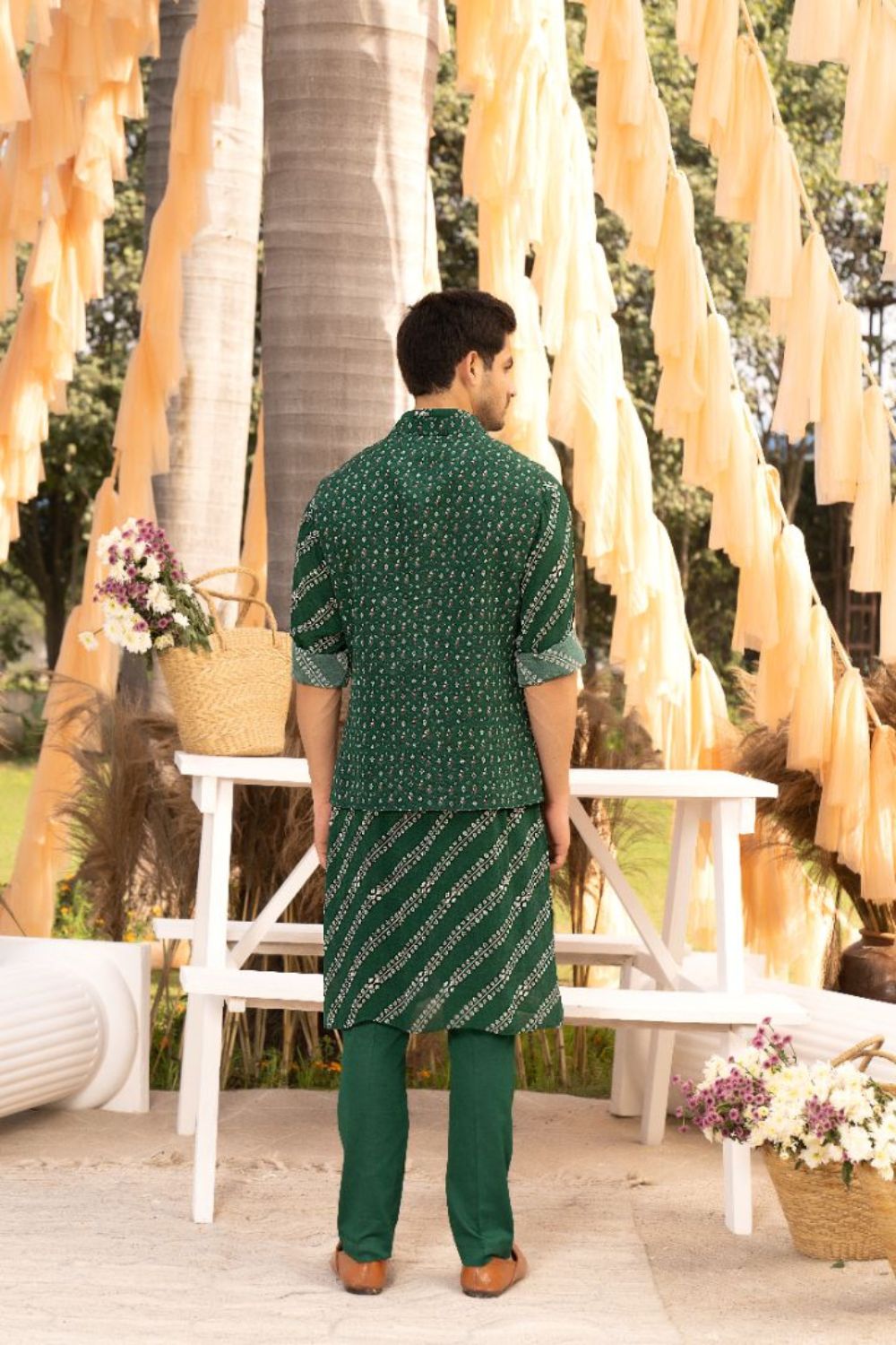 Featuring a bottle green stripe kurta with pants. It is paired with a printed bundi