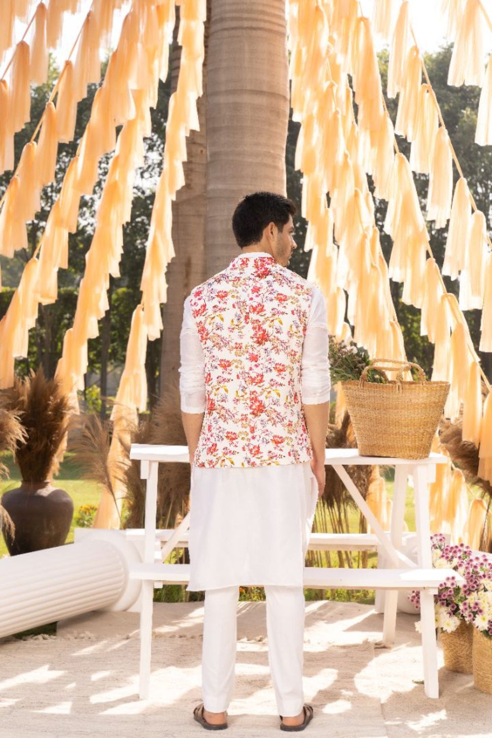 Featuring a off white printed bundi set. This set has has a kurta and a pant