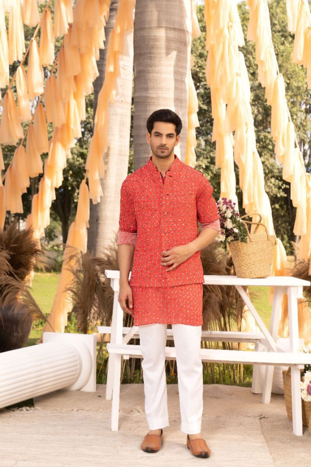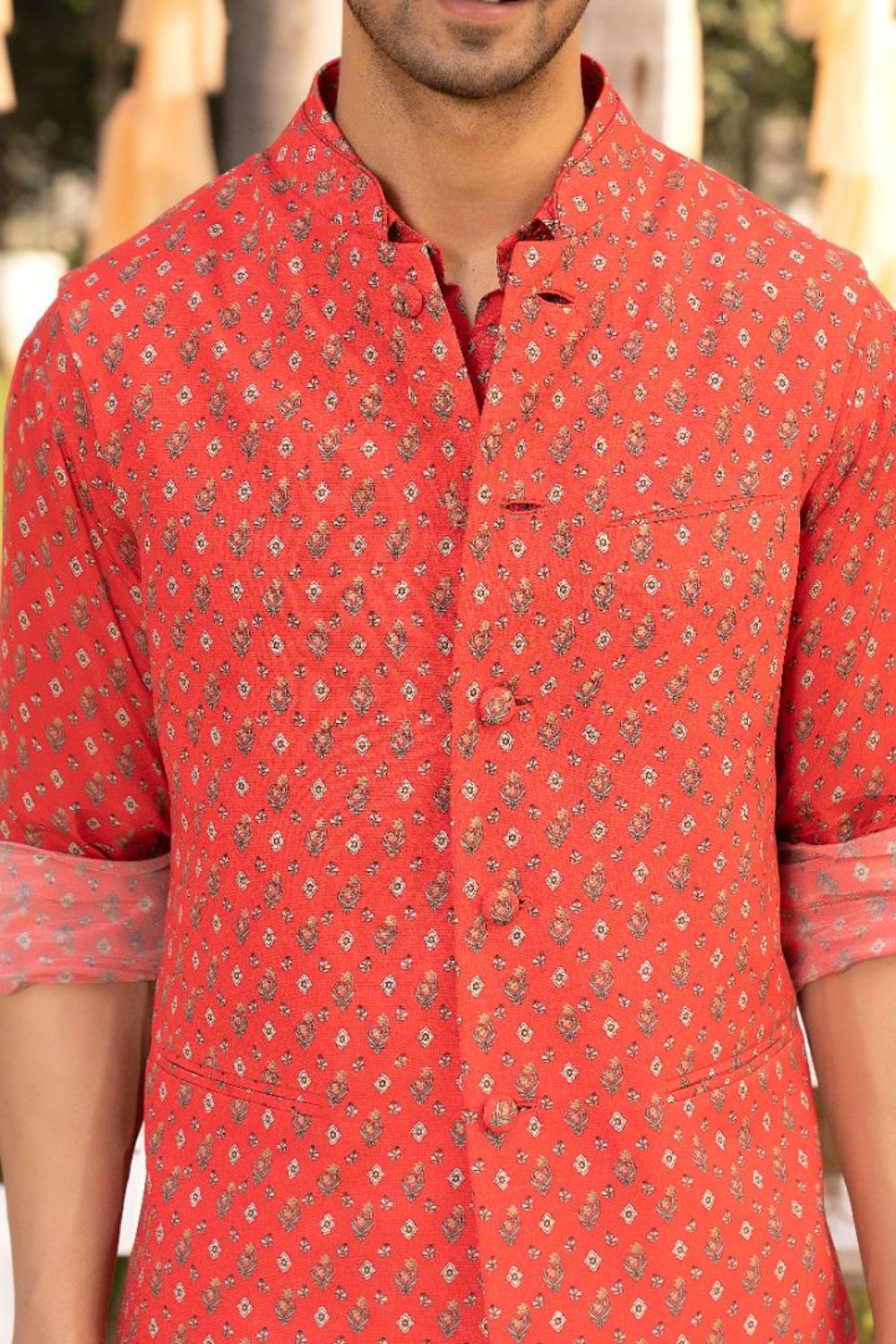 Featuring a red bootie printed kurta with pants. This set comes with a red bundi