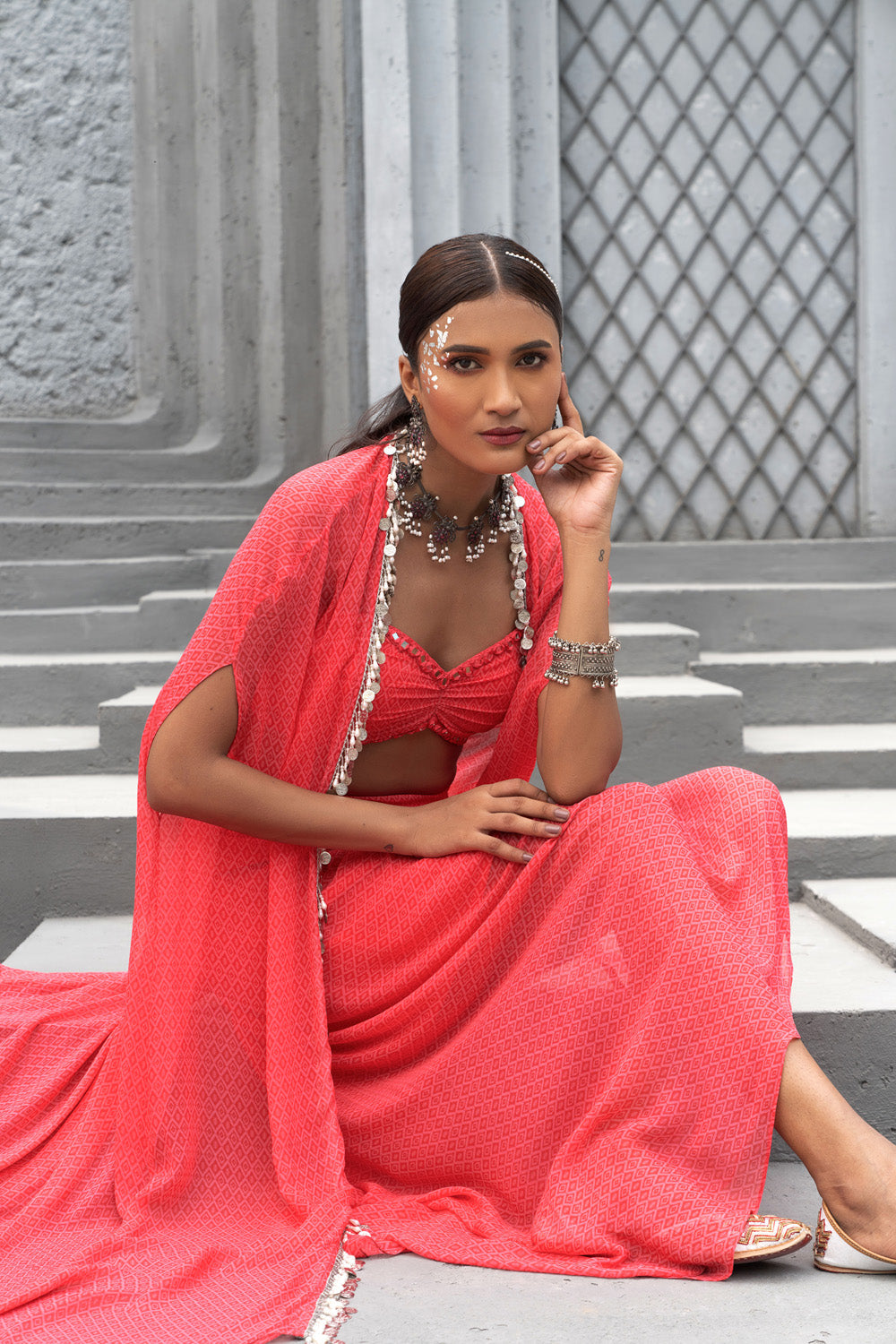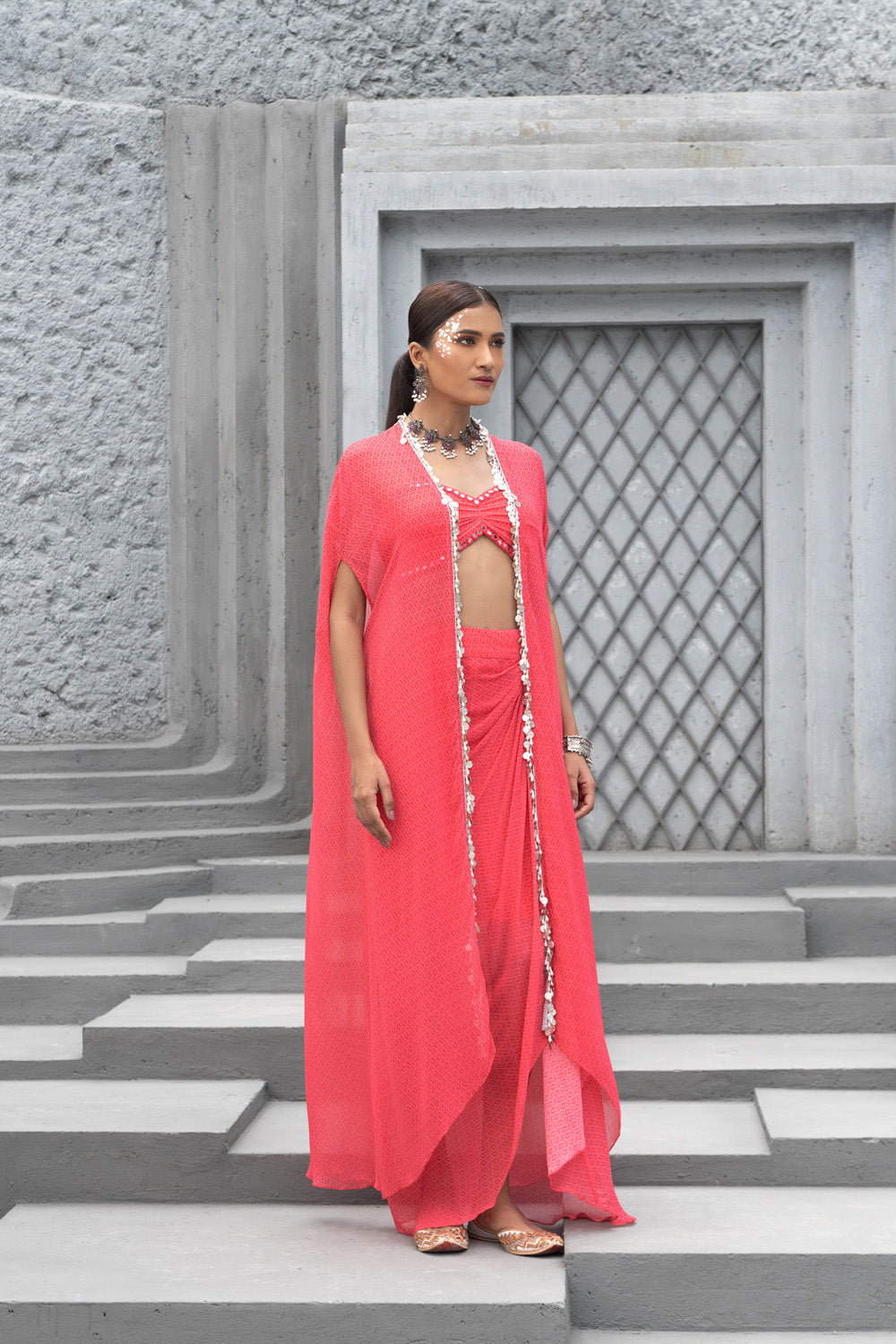 Featuring a raspberry pink printed draped skirt. it is paired with an mirror work inner and printed cape
