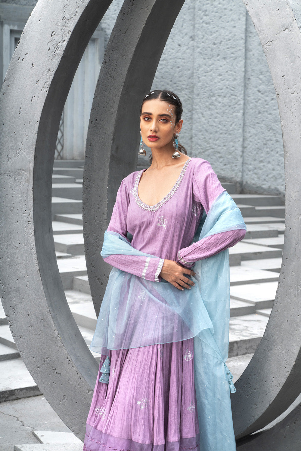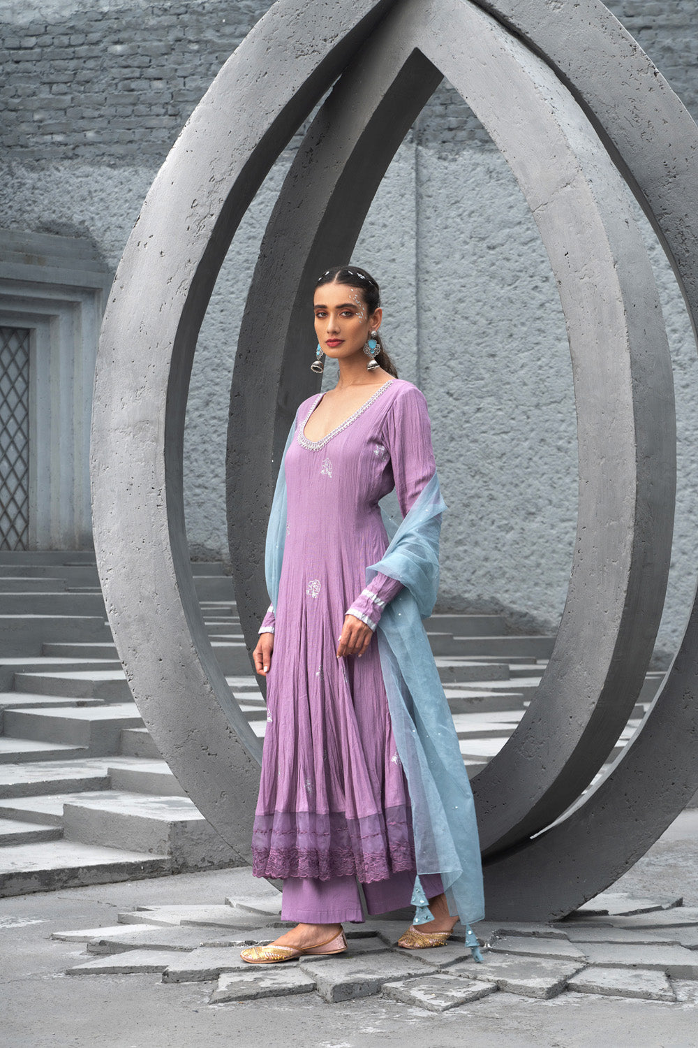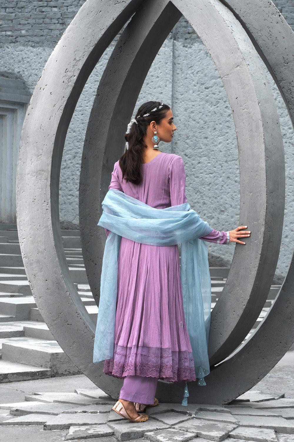 Featuring a lavender foil printed and embroidered anarkali kurta. this set comes with an organza dupatta and pants