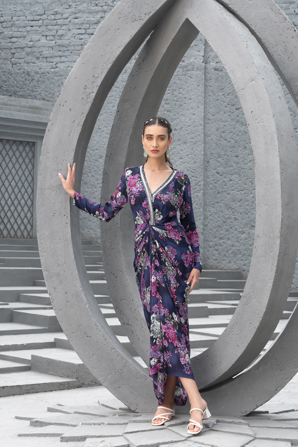 Featuring a navy blue printed draped dress. this has a hand embroidered neckline