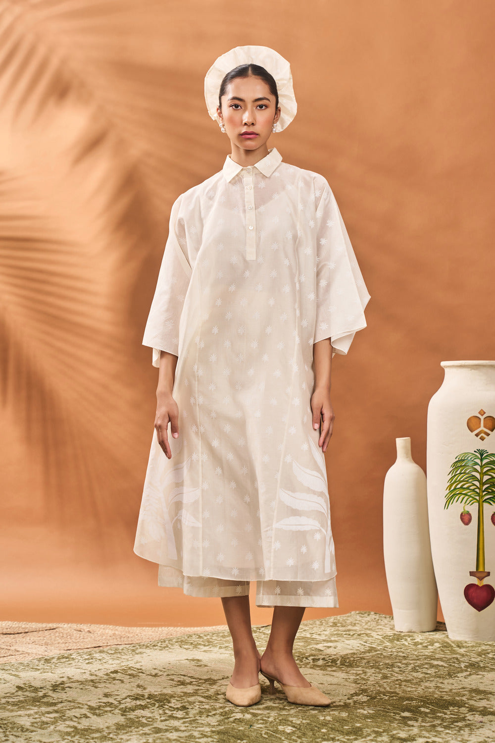 TUNIC - Popover placket with shirt collar | Batwing Sleeves | Side slits | Along with slip. Culottes pants | Calf length | Side pockets | Side zipper closure.