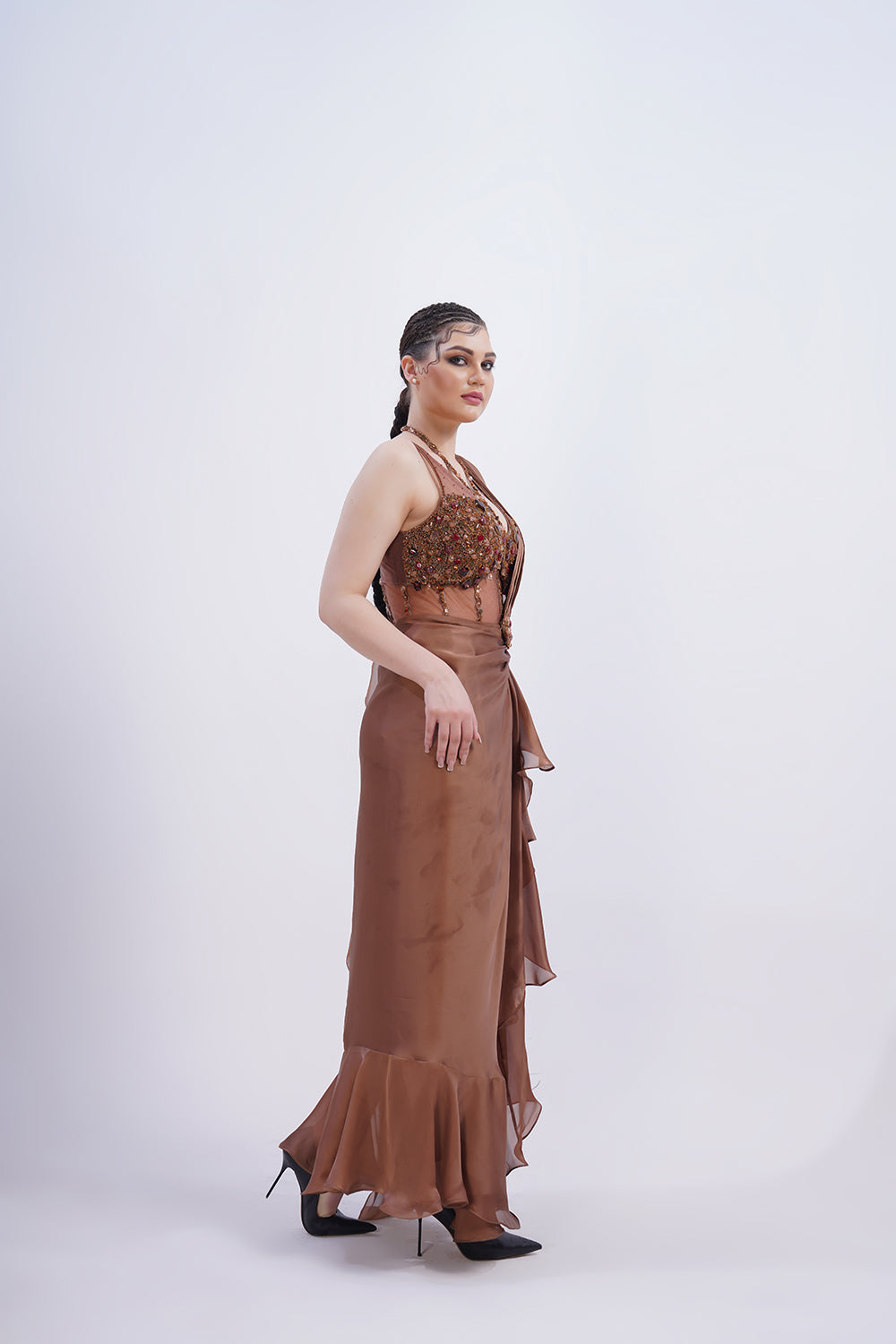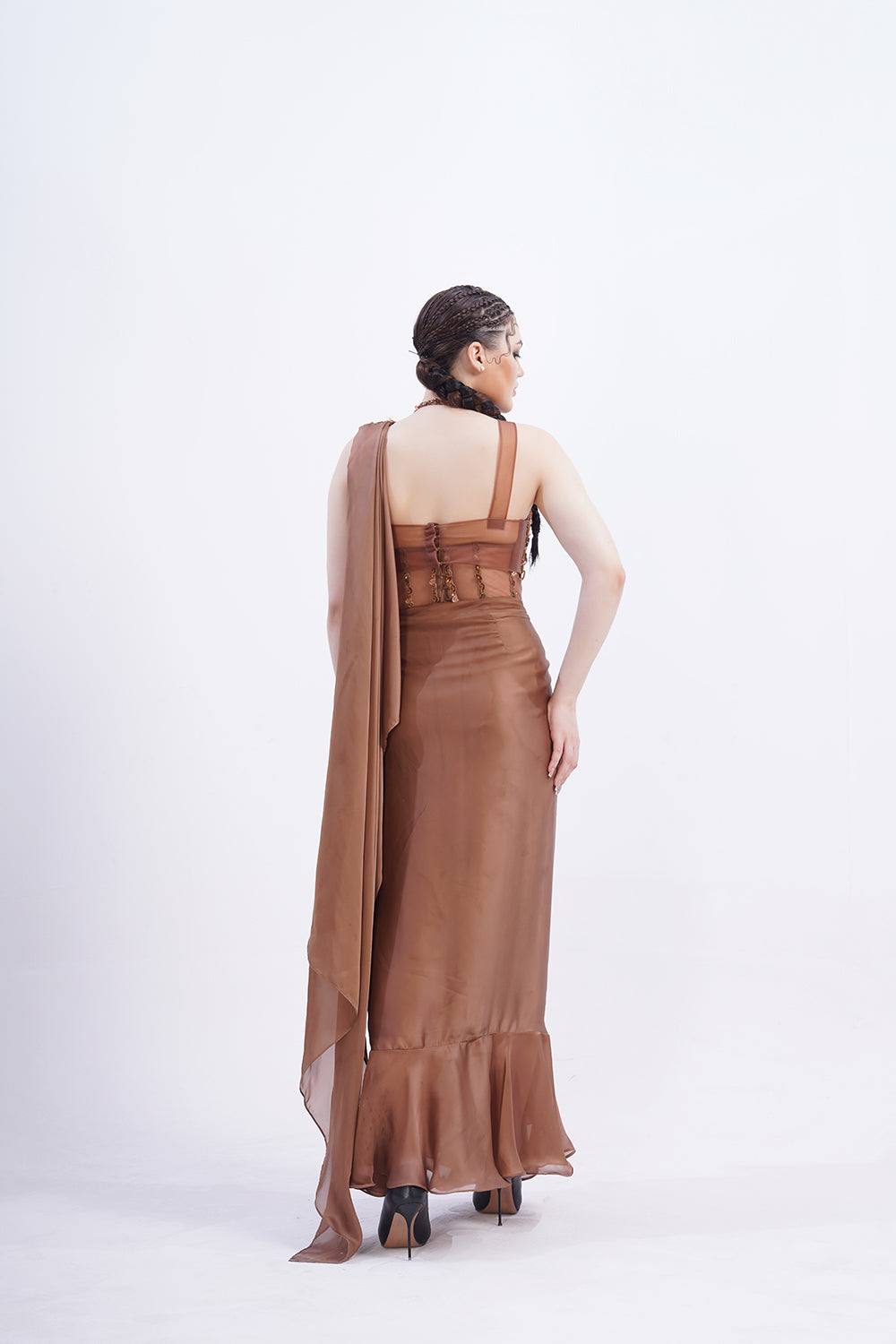 Corset saree in Modal Satin fabric with ruffle effect at bottom. Corset and blouse are separate and can be worn separately.
