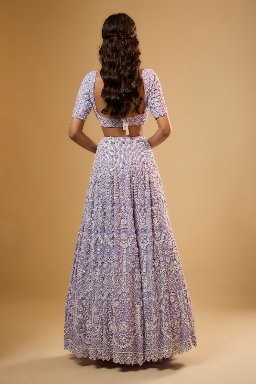 This set features a lavender georgette lehenga set. The blouse is a scoop neck with elbow sleeves & buttis all over. The ensemble is embroidered all over with ivory glass beads, threadwork & sequins in floral & bagru motifs. A georgette dupatta with matching border and buttis completes the look. Cancan, pockets and drawstrings in lehenga are included.