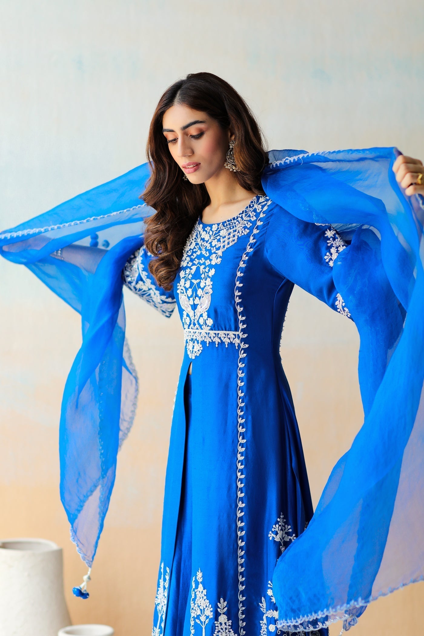 Featuring a cobalt blue kurta set with sharara in dupion silk base with white floral thread embroidery highlighted with sequins, cut dana and various other embellishments. It is paired with an embroidered organza dupatta.