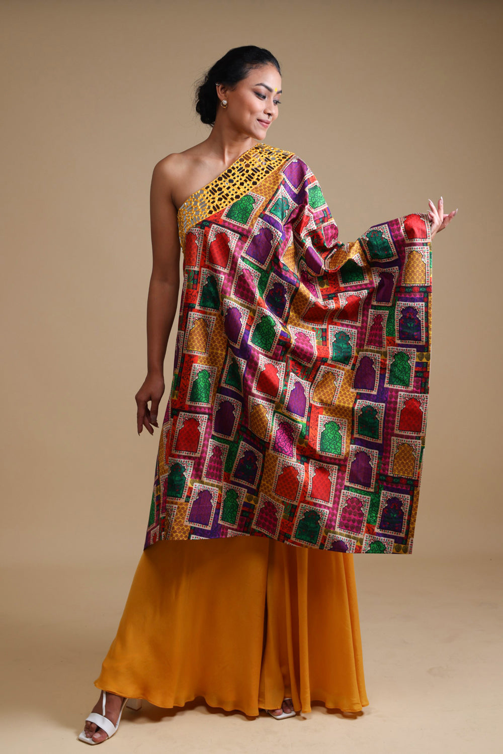 • this chique kurta features a stylish off-shoulder silhouette, combining contemporary fashion with traditional craftsmanship for a unique look.