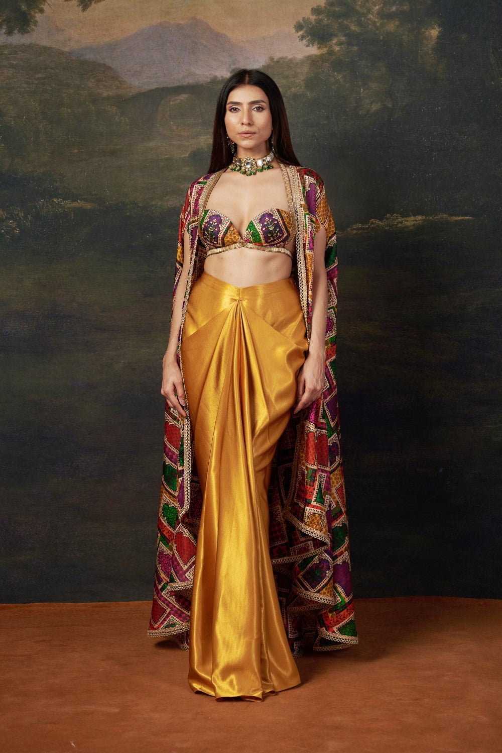 Bold Bralette Blouse with Embellished Handwork, Cape & Dhoti