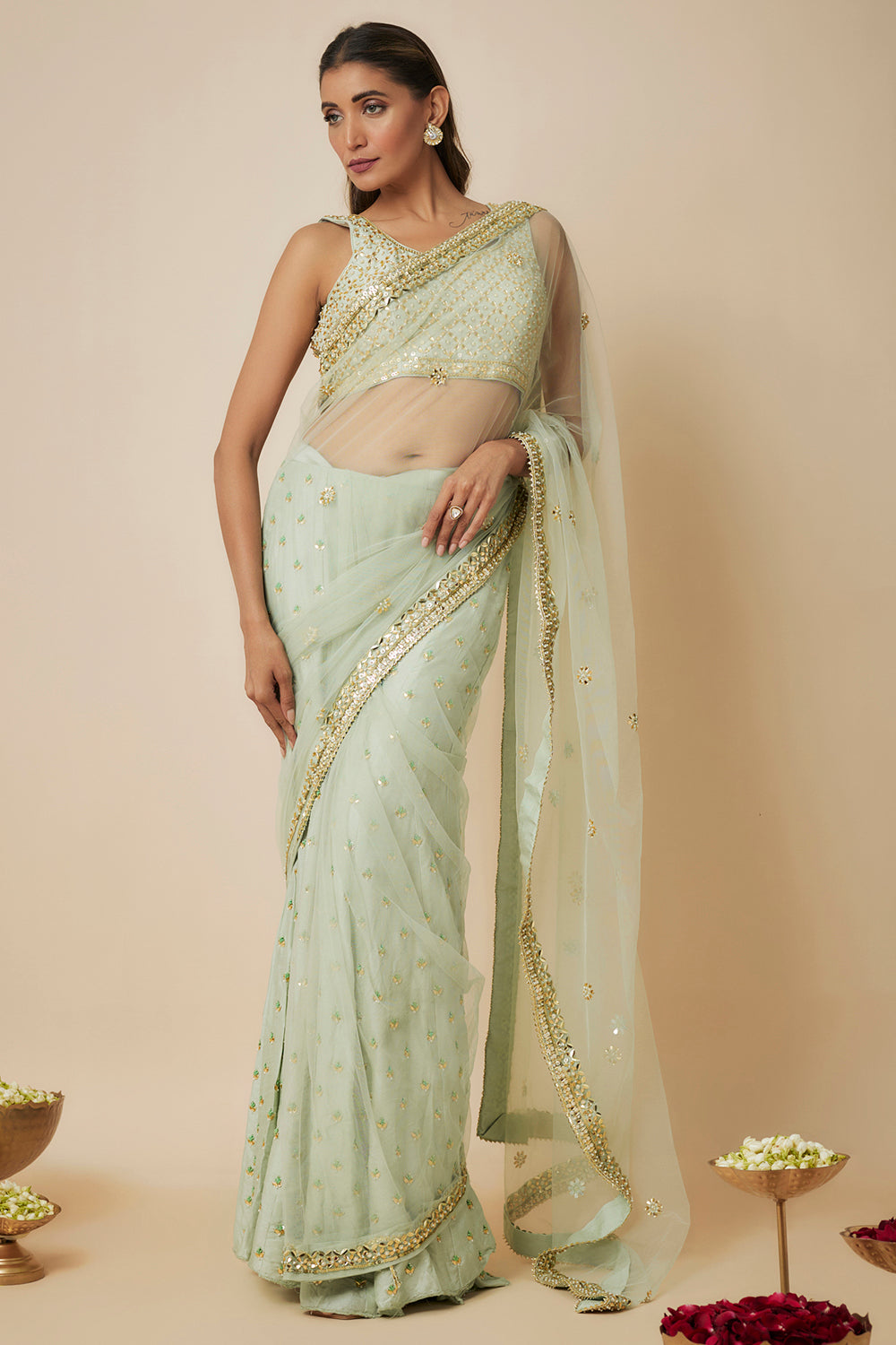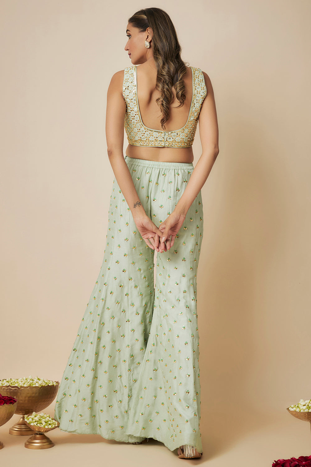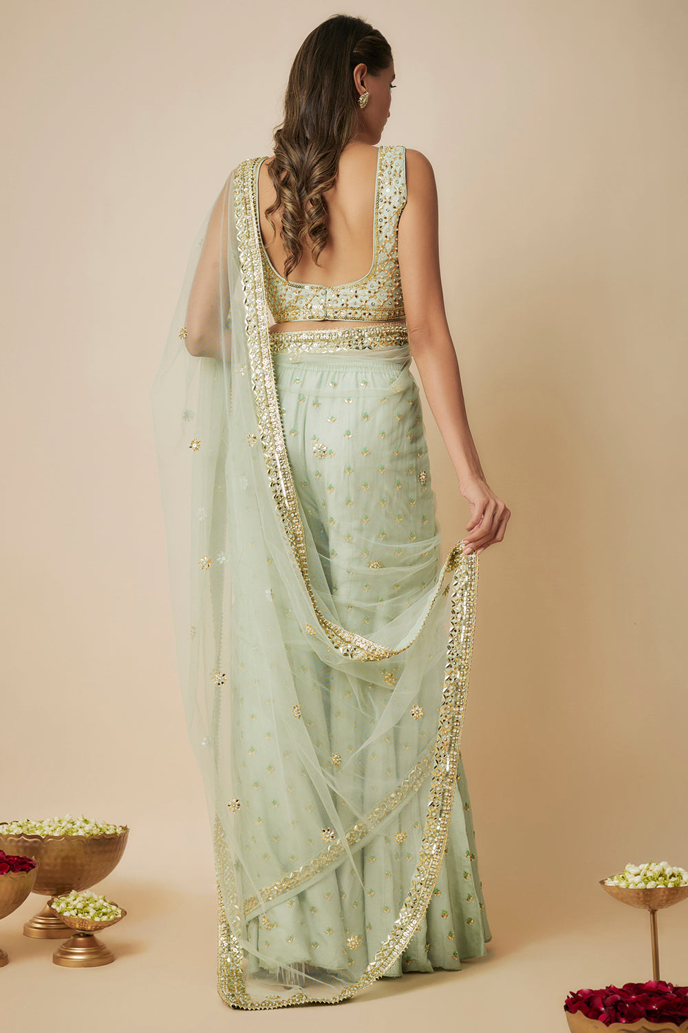 A delicate pista green embroidered sharara sari set, crafted in a beautiful pastel hue, features intricately embroidered pants, a chic choli, and a versatile sheer dupatta that doubles as a sari drape. perfectly elegant and effortlessly classy, it’s an ideal choice for bridesmaids or the sister of the bride or groom. a timeless blend of grace and sophistication for any celebration.