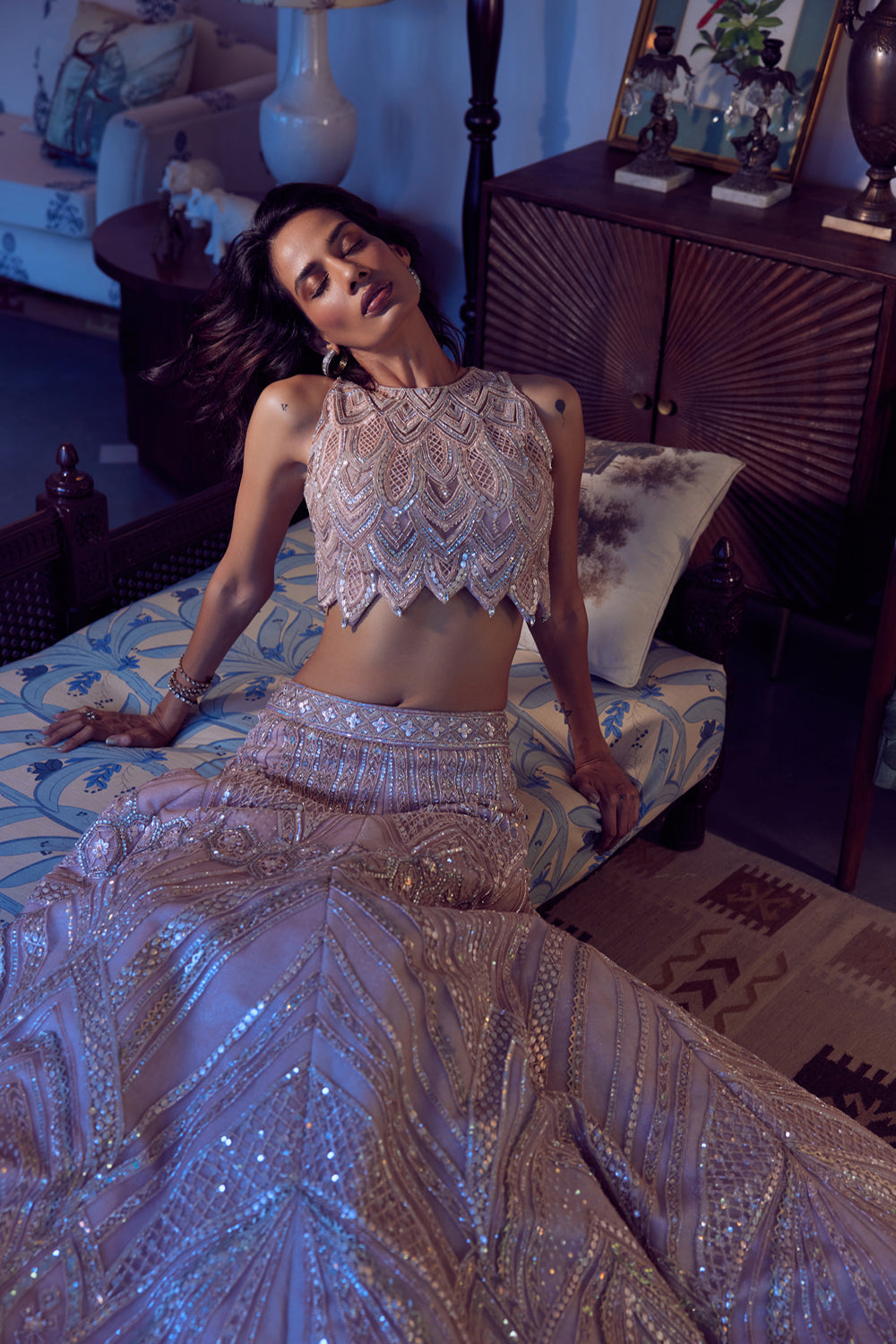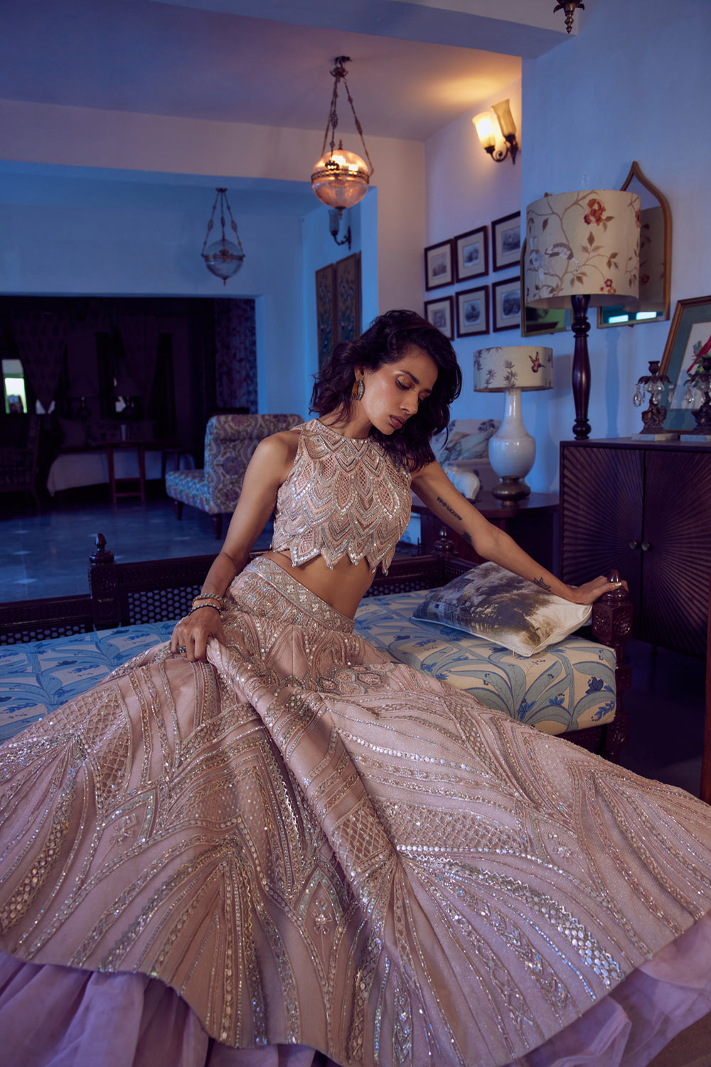 Pink champagne shimmer tulle lehenga skirt hand embroidered with sequins, beads, crystals, metallic threads, paired with a scalloped sleeveless blouse and a matching tulle dupatta