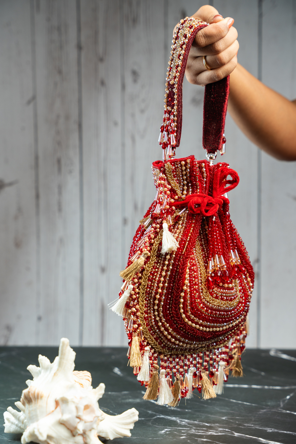 The Baraq Potli is a stunning blend of elegance and craftsmanship, featuring lustrous beads and intricate work in a maroon and gold palette. Finished with delicate tassels, it’s the perfect accessory for weddings, festive events, or evening soirées.