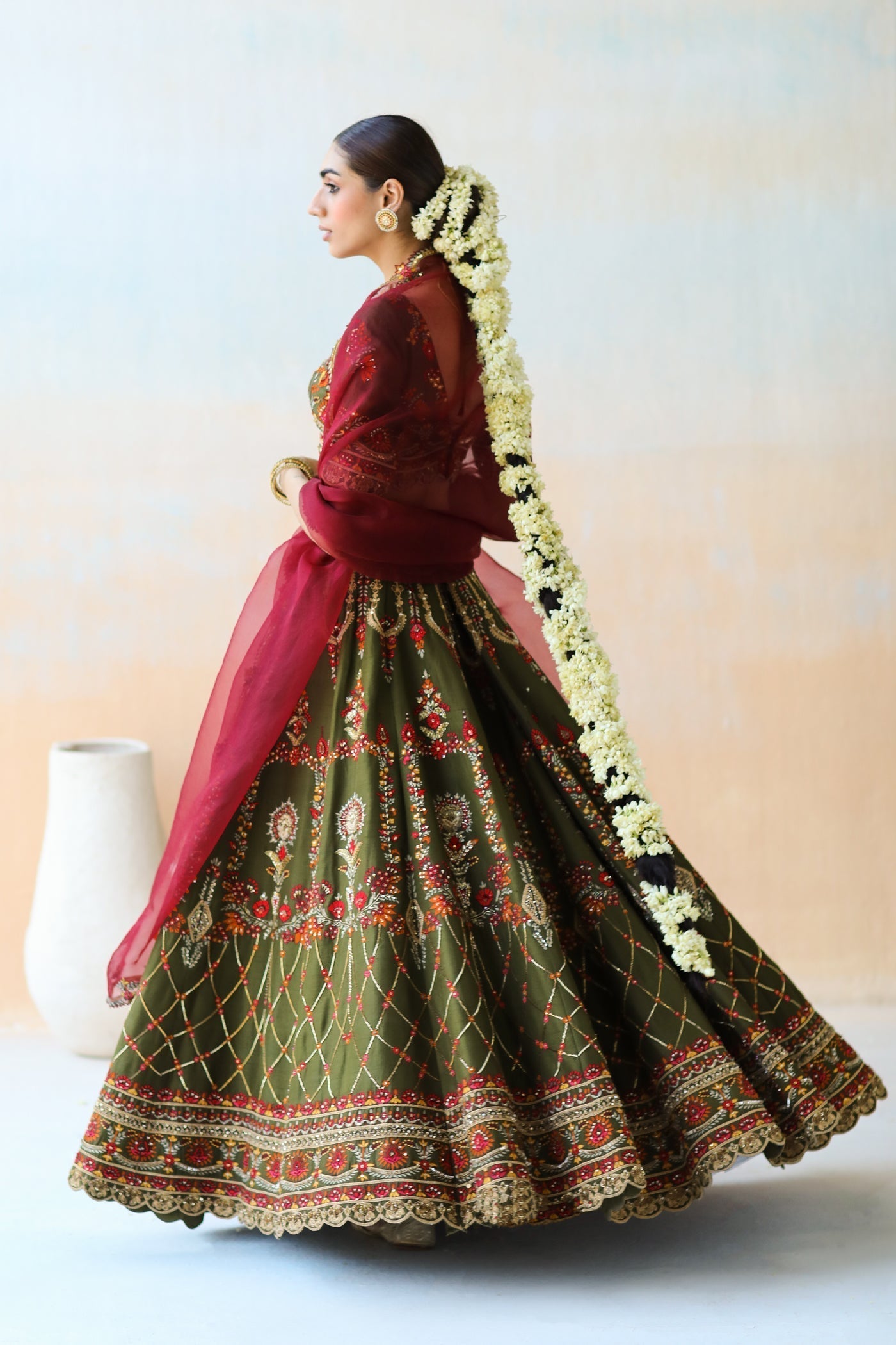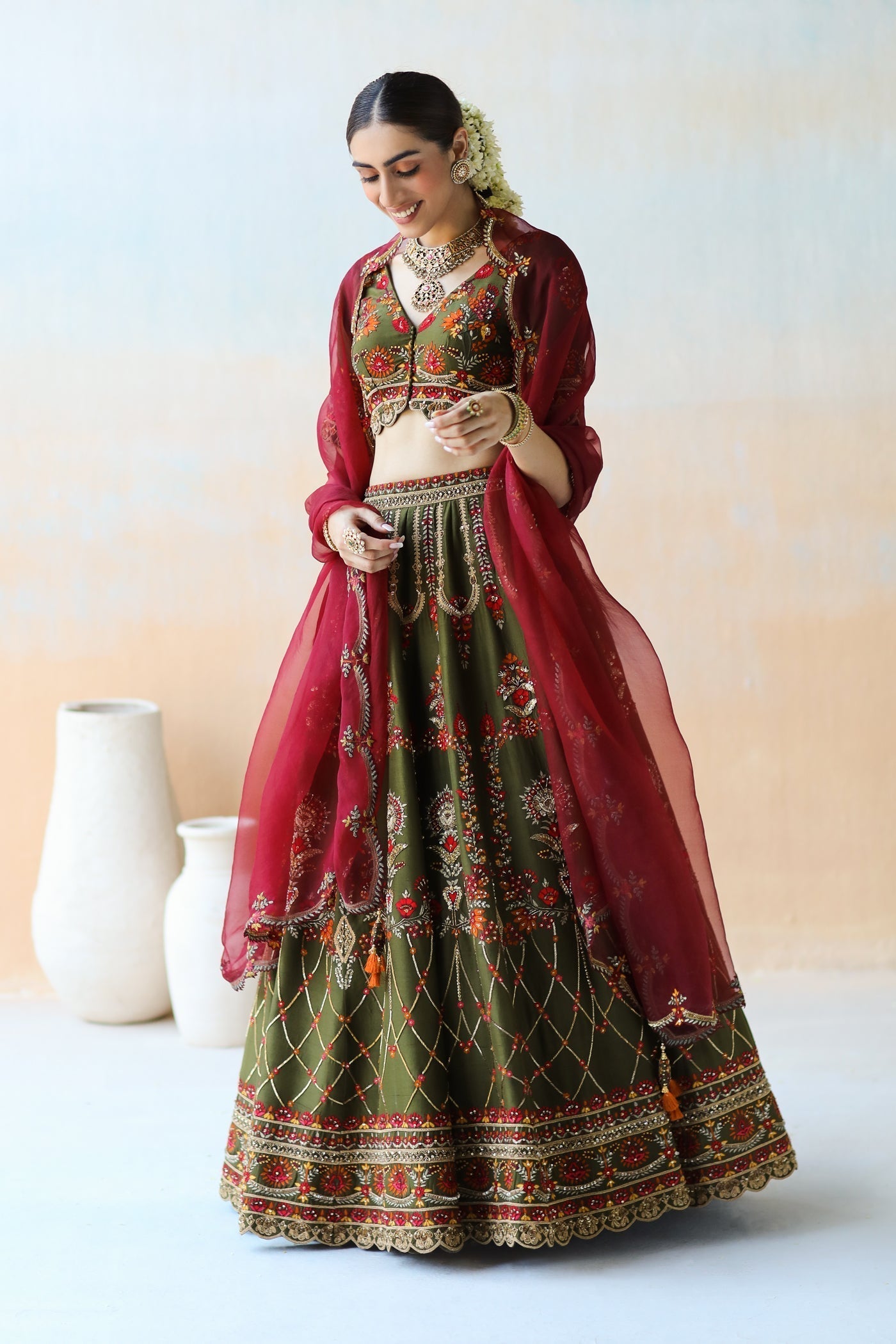 A deep olive green lehenga set in dupion silk base featuring mutli-colored floral thread embroidery highlighted with sequins, cut dana and various other embellishments. it is paired up with an embroidered organza dupatta.