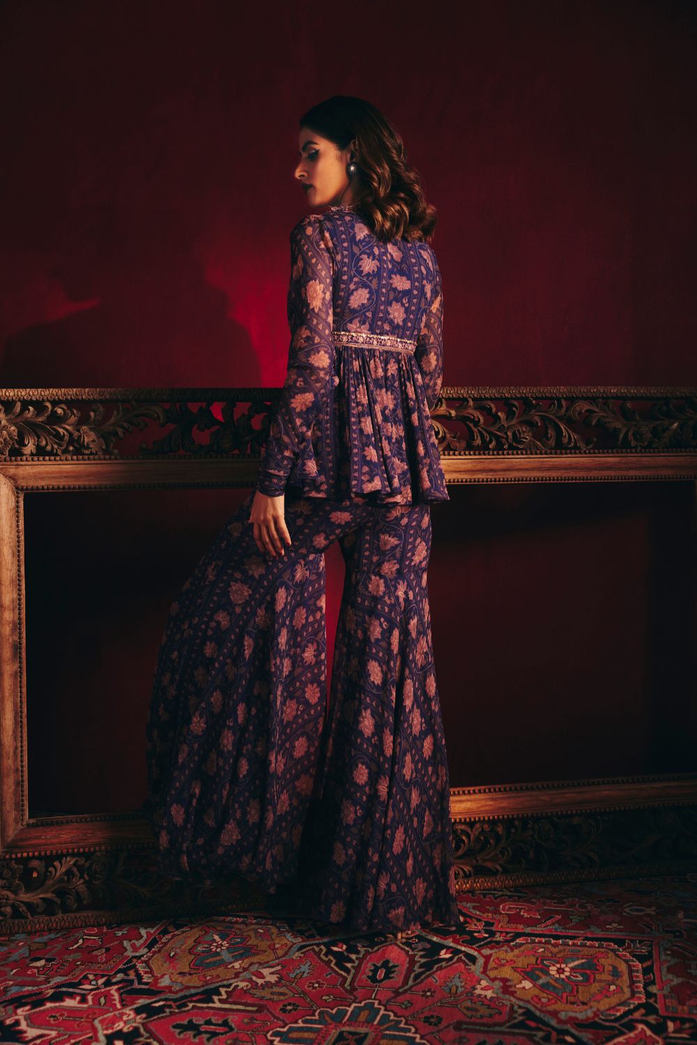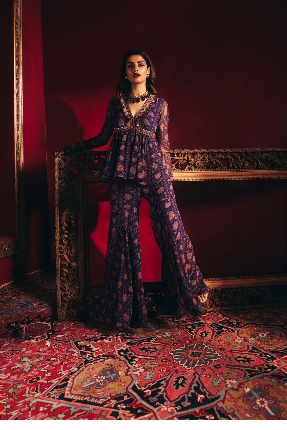 Navy printed chiffon embroidered peplum with printed chiffon gharara and net dupatta with small printed four side border