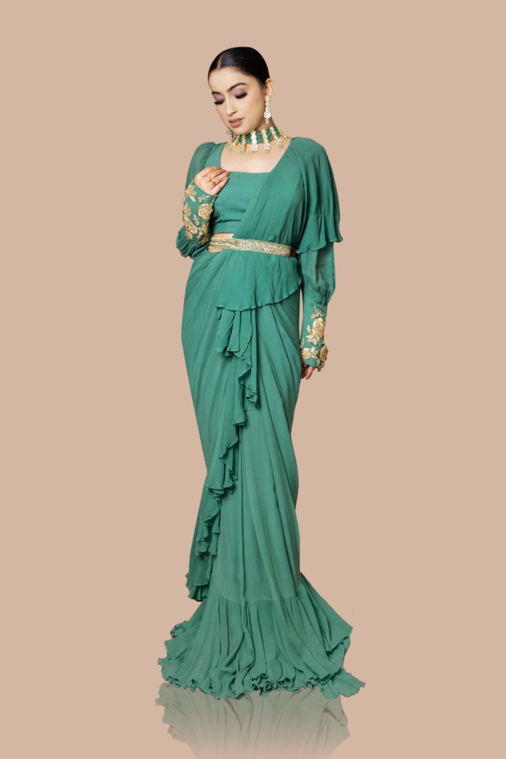 Drape Saree With Ruffles Paired With Blouse And Waist Belt