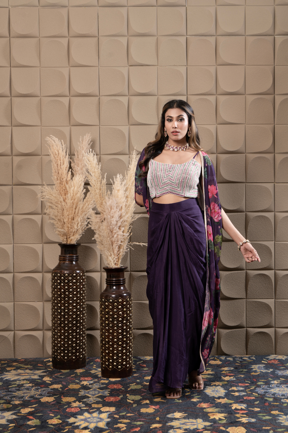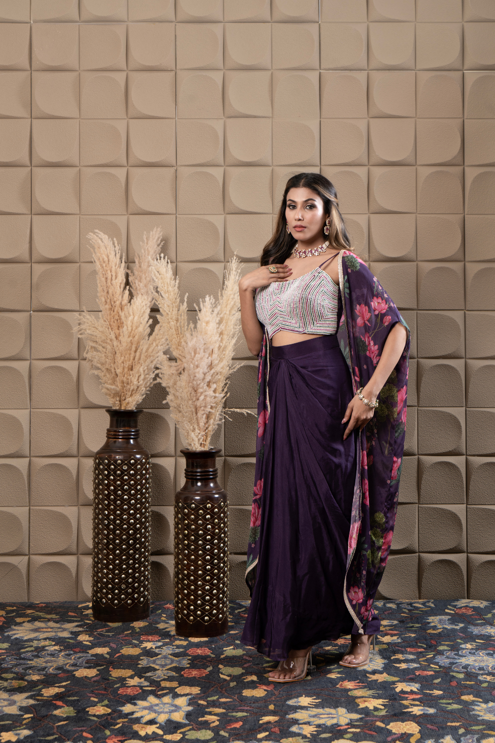 CHIFFON DRAPE SKRT WITH PRINTED EMBROIDERED BORDER ON CHIFFON CAPE, PEARL AND CUUTDANA EMBROIDERED BUSTIER