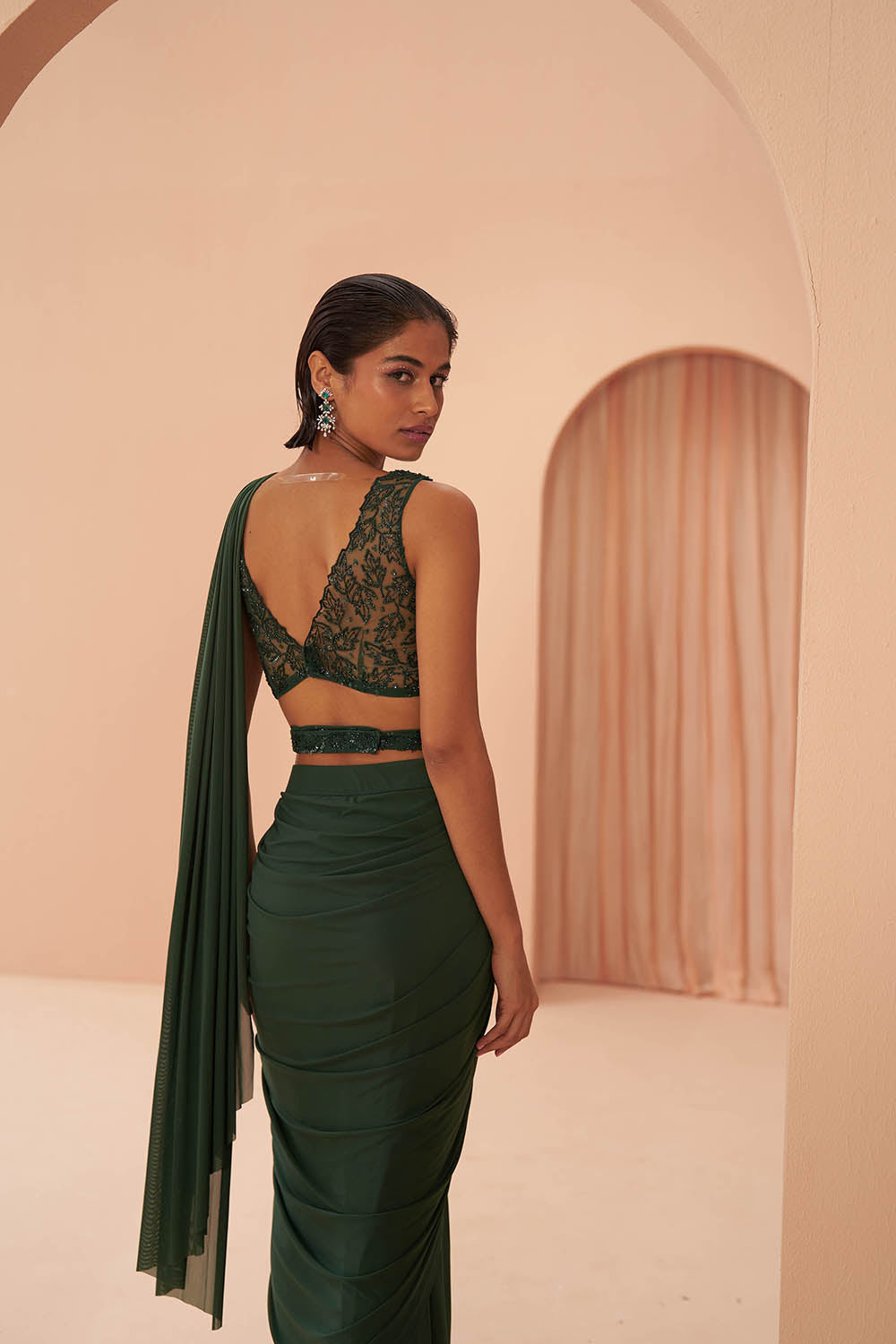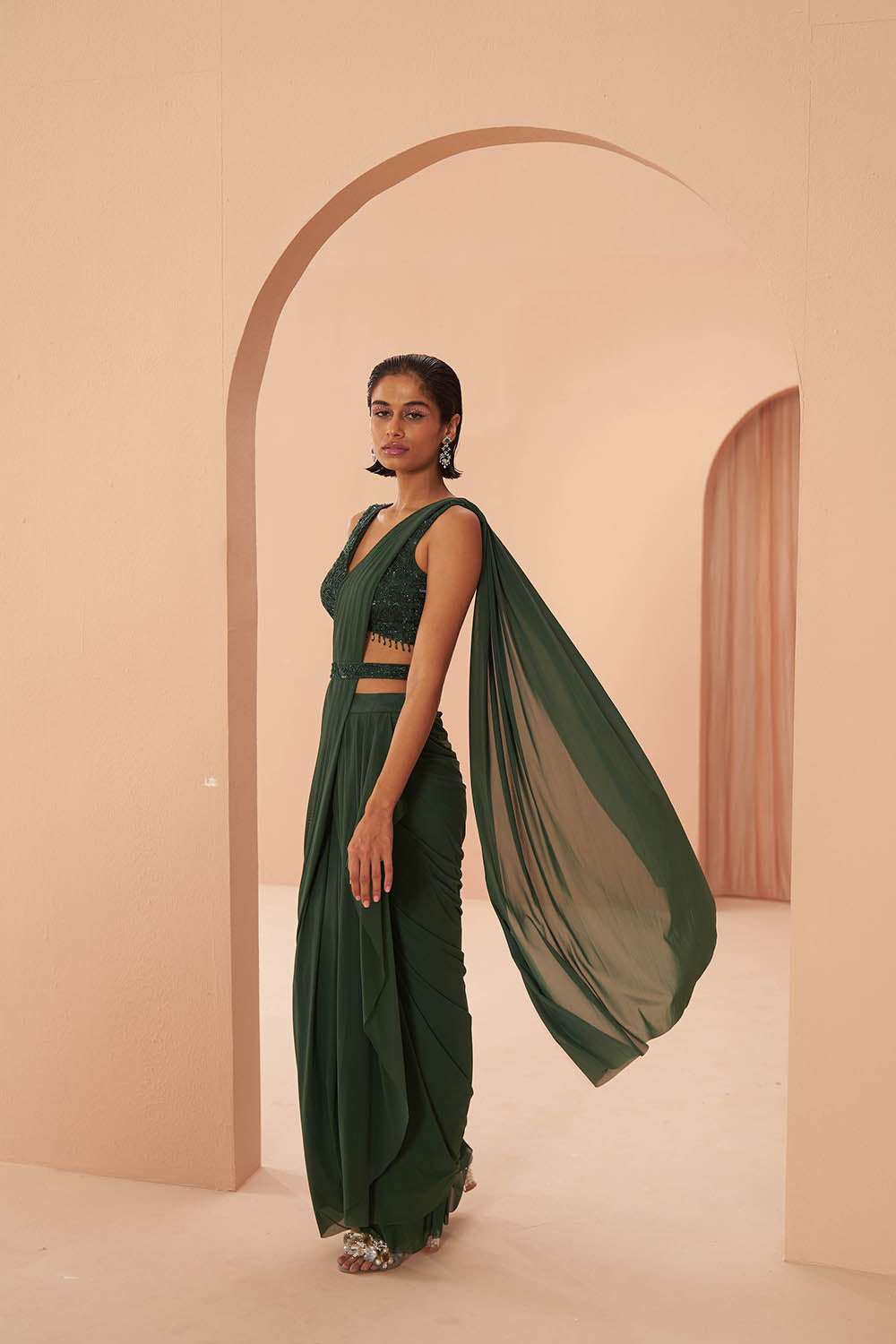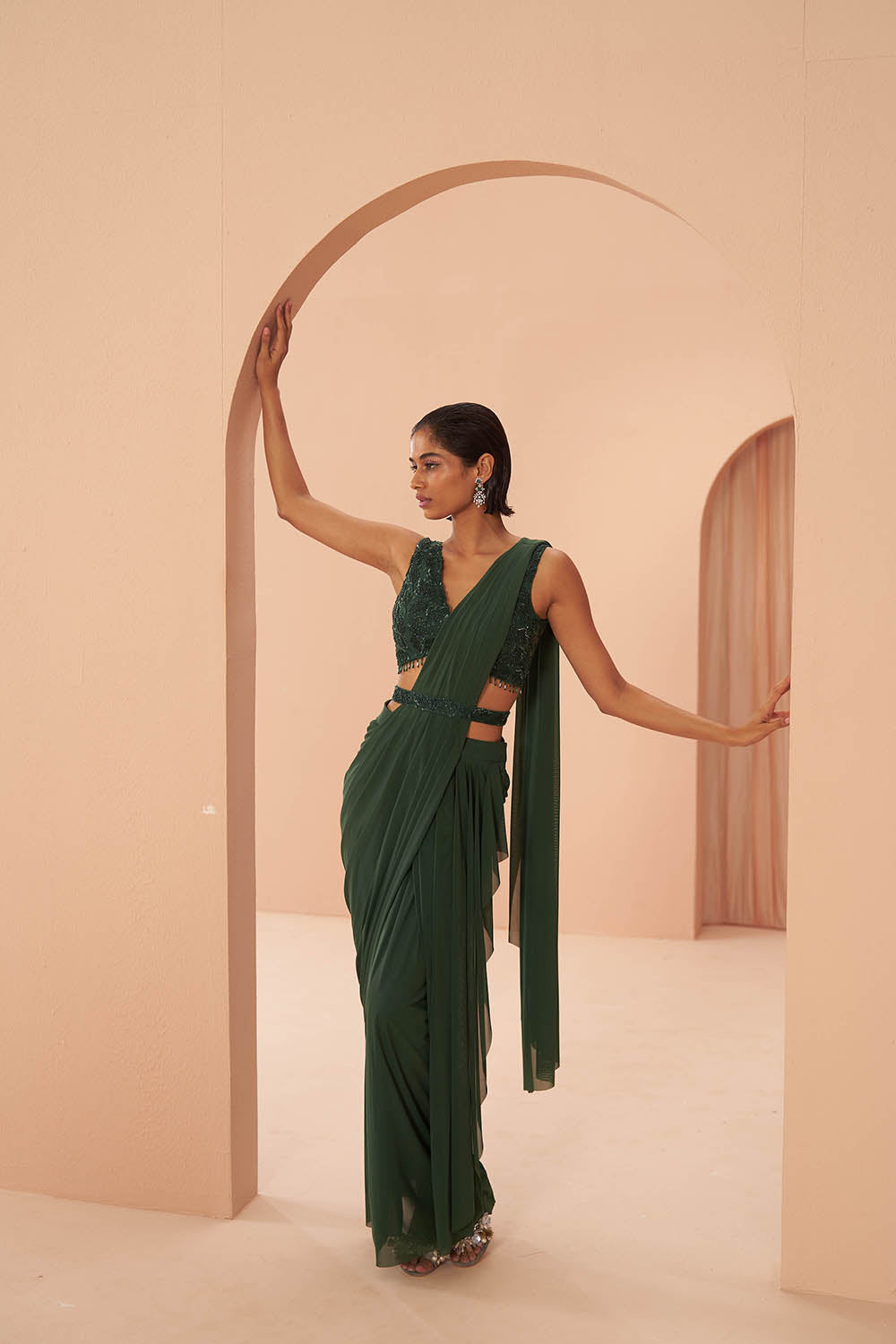 A stunning sleek pre draped saree with tonal leaf motif embroidery on blouse and belt