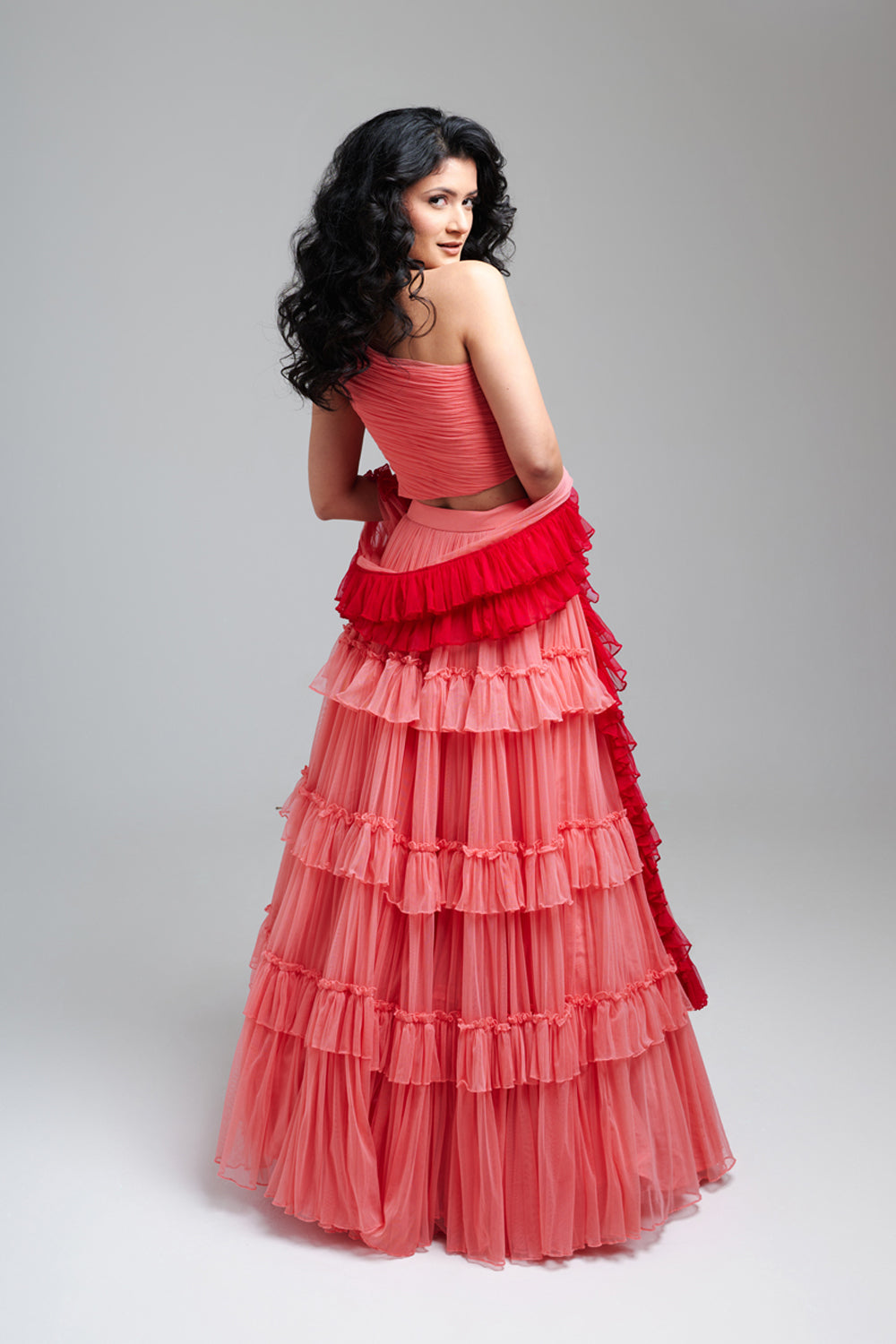 This soft net ensemble boasts a dark peach one shoulder rouched