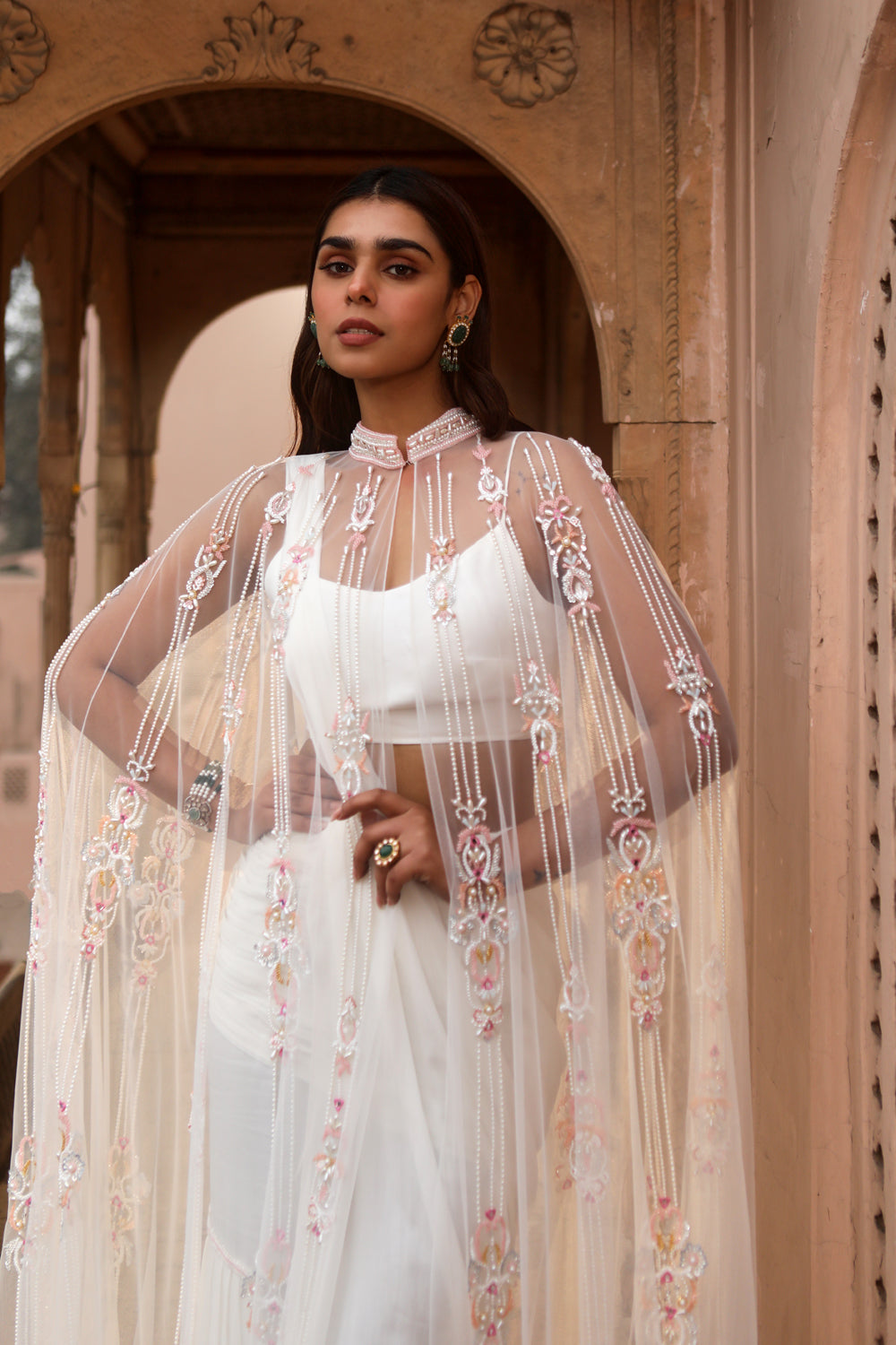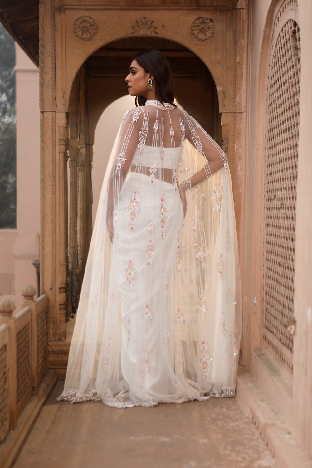 Embroidered net cape with a bustier and fusion drape saree set