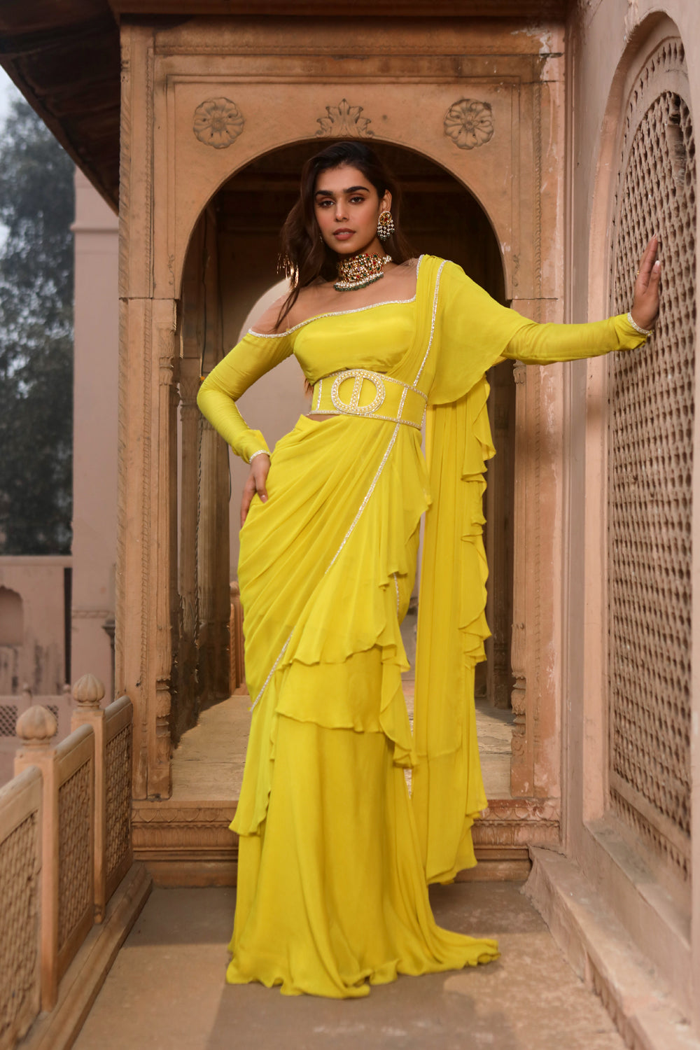 Embroidred beads detailing blouse and belt with a drape ruffle saree set
